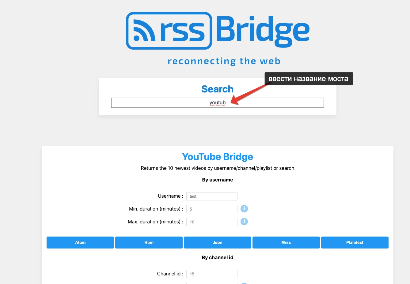 После этого доступ к плагину будет по ссылке sitename.ru/rss-bridge/