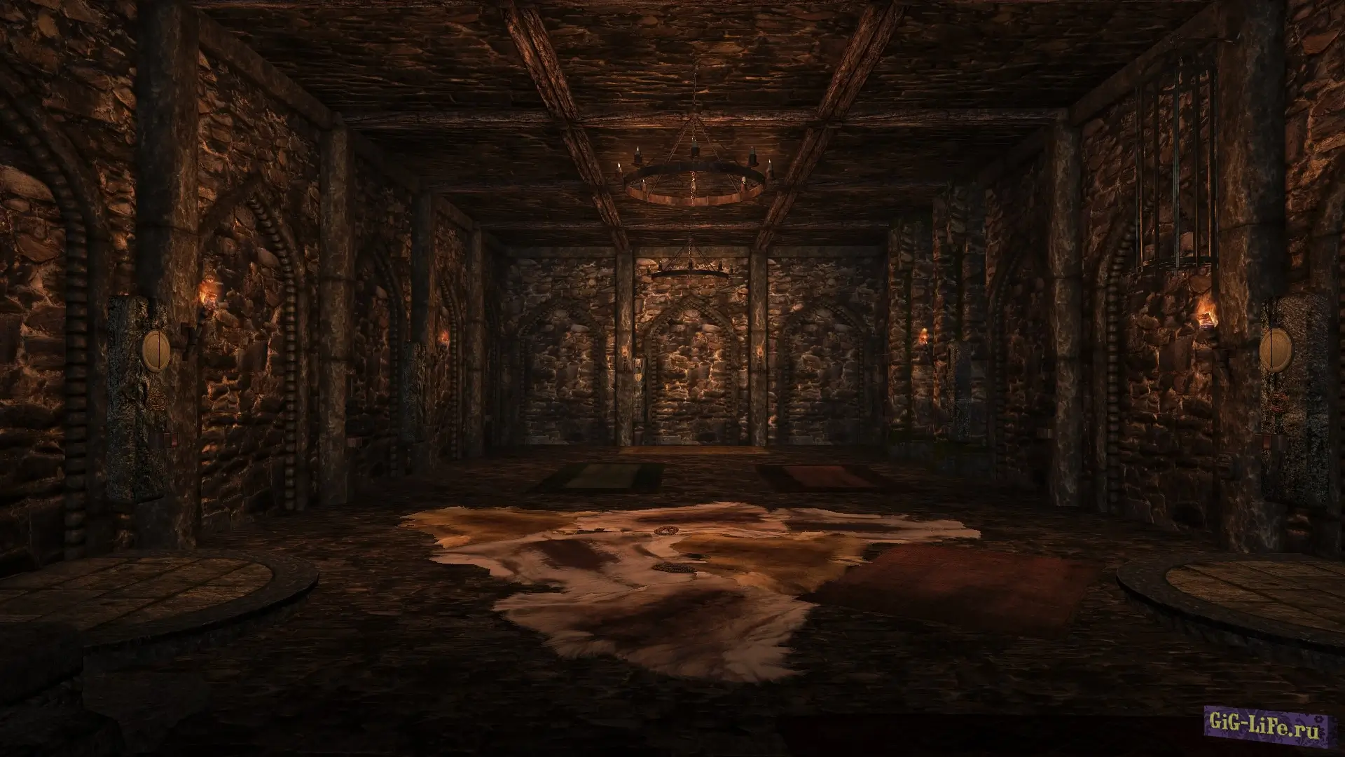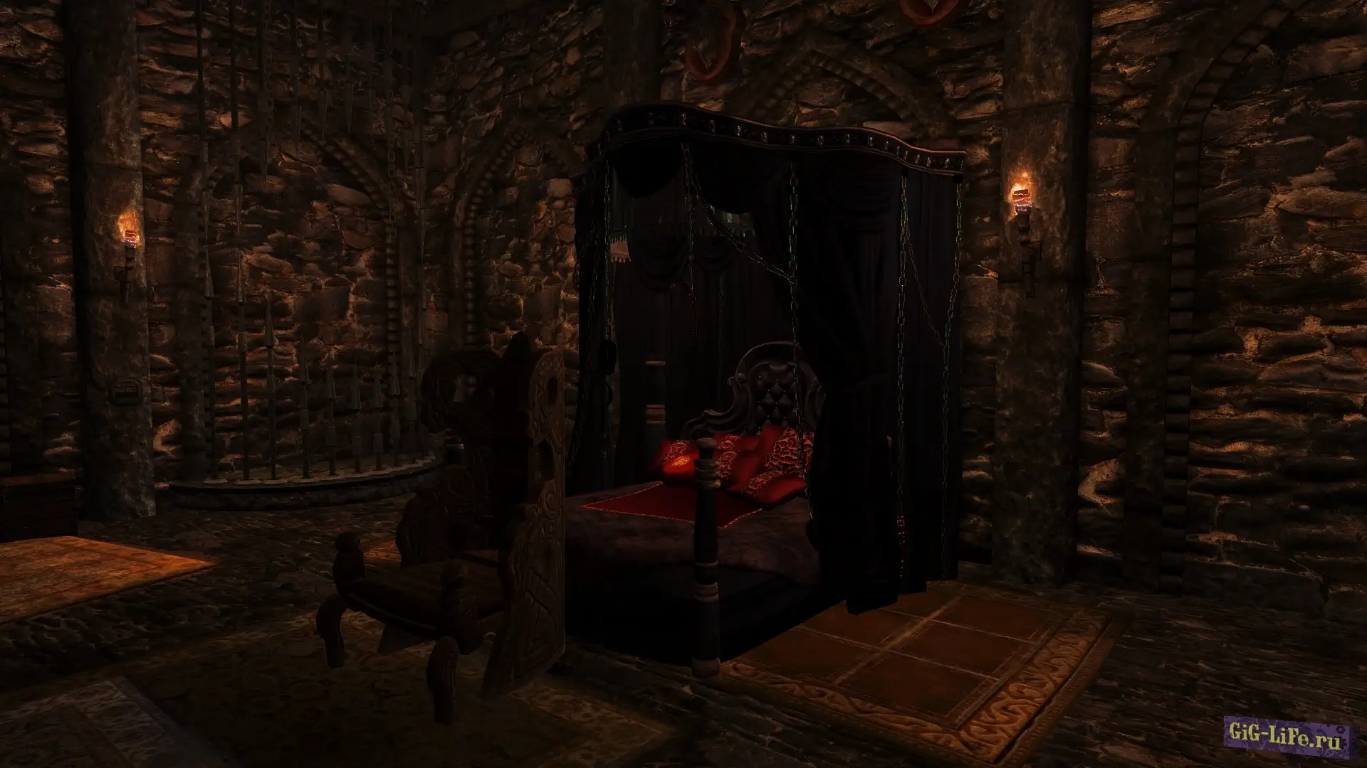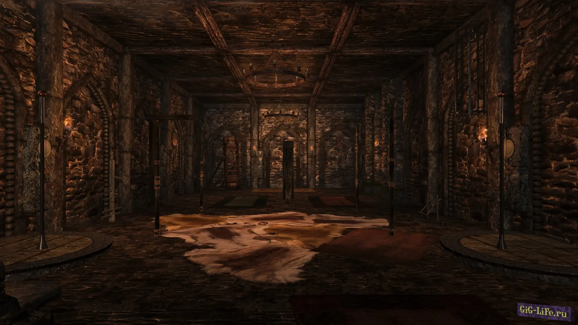 Все устройства в основном зале по умолчанию отключены. Их можно включить с помощью активаторов на стенах. Там же можно включить кровать (оркскую, благородную или BDSM). По умолчанию в подземельях темно, но есть большое количество держателей для факелов и активаторы источников света.