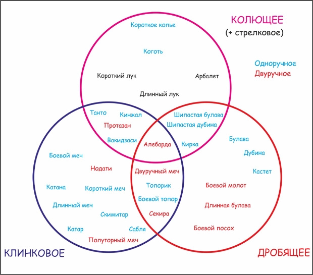 Оружие теперь делится не только по типам, но и по классам: клинковое, дробящее, колющее (включая метательное). Большинство перков затрагивают именно классы оружия, а не типы. Некоторое оружие может принадлежать к нескольким классам сразу, см. диаграмму ниже.