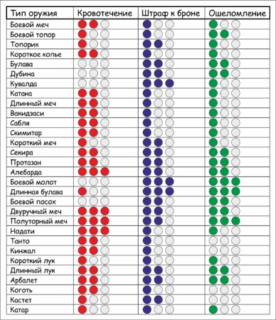 Каждый тип оружия также имеет ряд дополнительных параметров - кровотечение, штрафы к броне и ошеломление. Ранг кровотечения определяет наносимый им урон, ранг штрафа к броне определяет насколько у цели снизятся сопротивляемости к урону и, наконец, ранг ошеломления определяет насколько часто успешные удары будут ошеломлять противника. Таблица рангов для всего оружия приведена ниже.