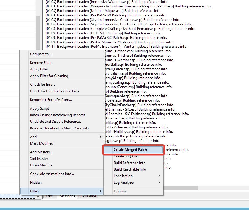 Переместитесь в конец списка модов, вызовите меню и выберите опцию создание Merged Patch, при запросе указав имя файла без расширения:
