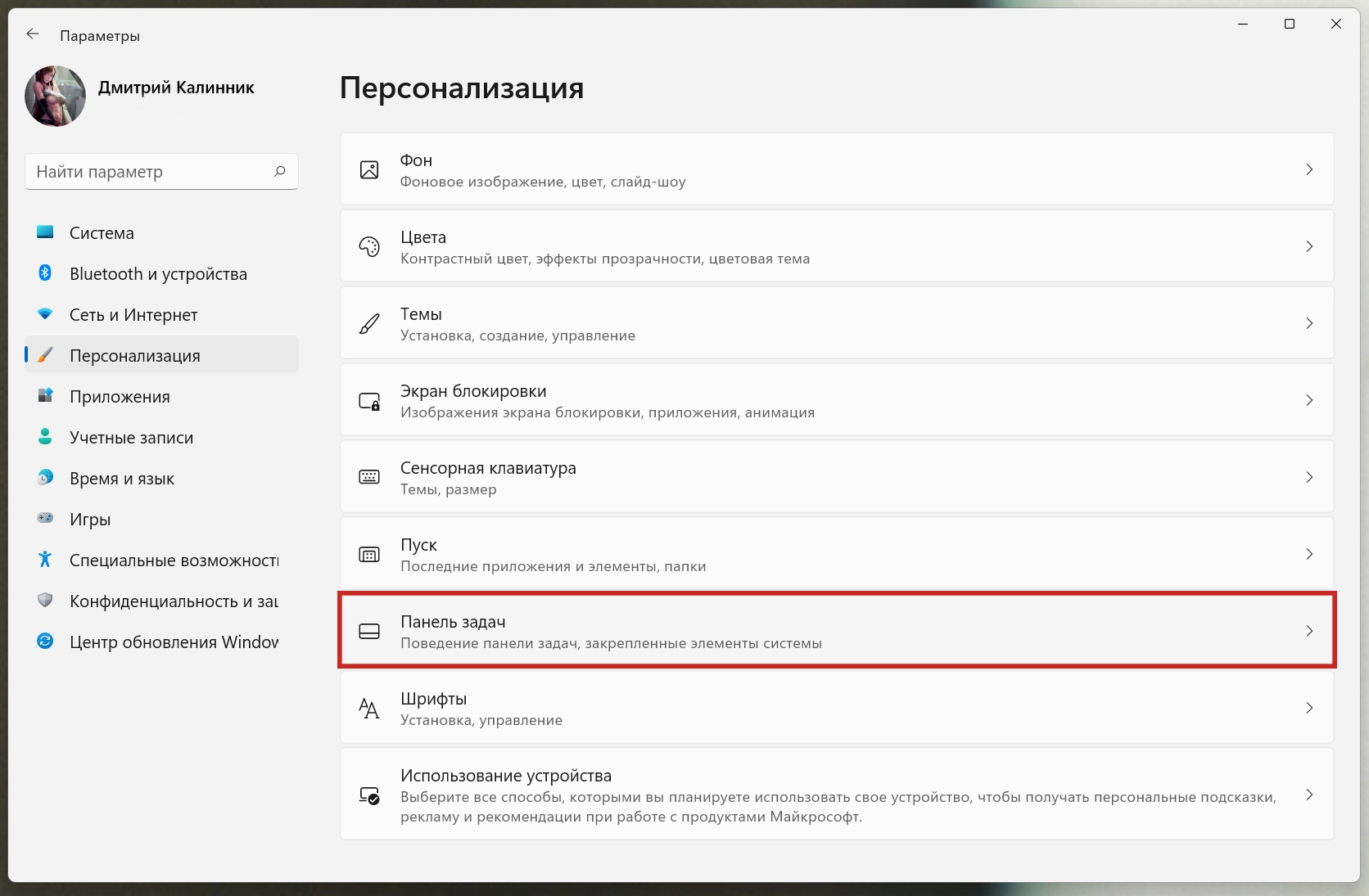 - В приложении «Параметры» откройте вкладку «Персонализация».