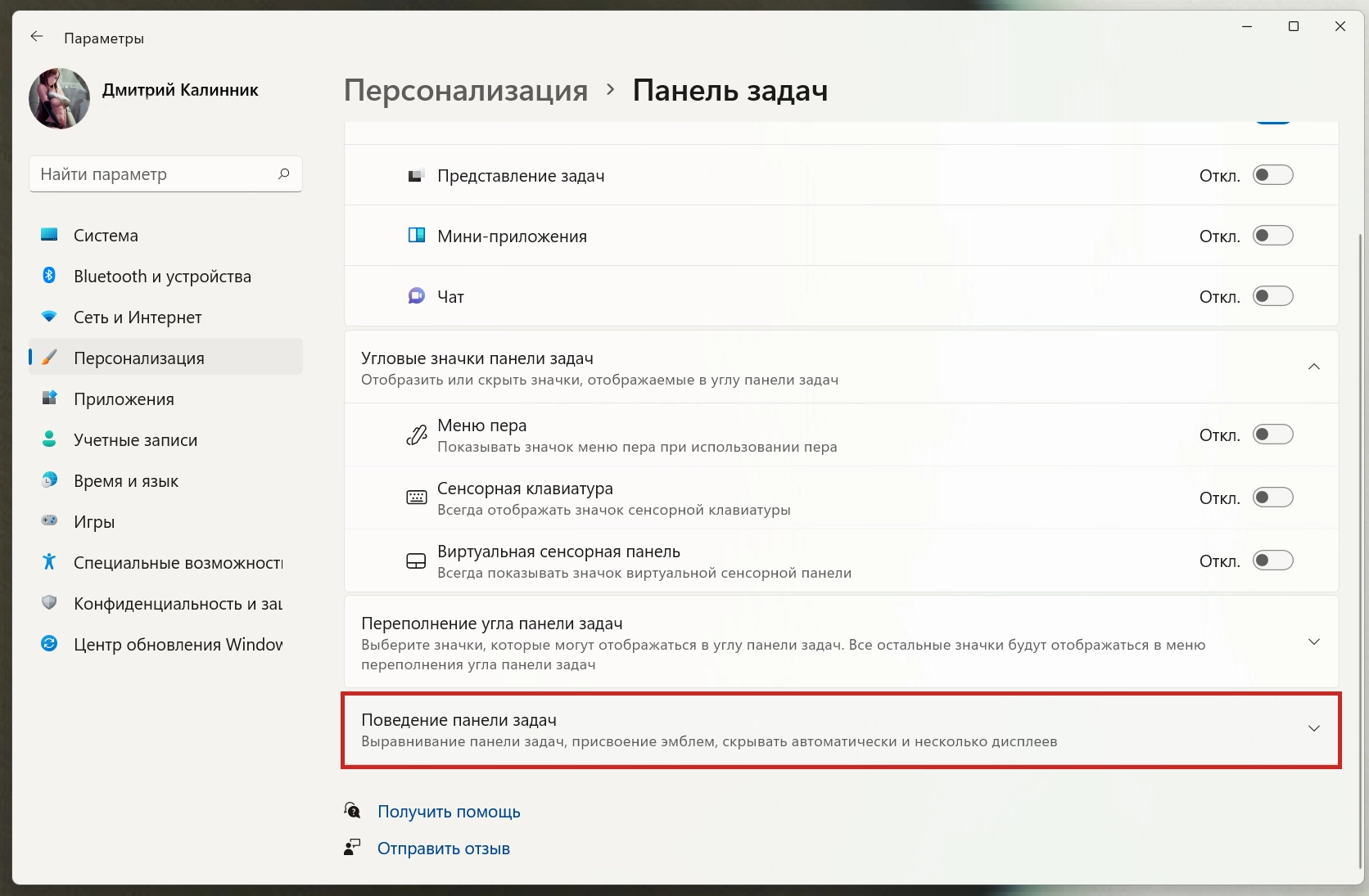 - В окне «Персонализация > Панель задач» найдите опцию «Поведение панели задач».