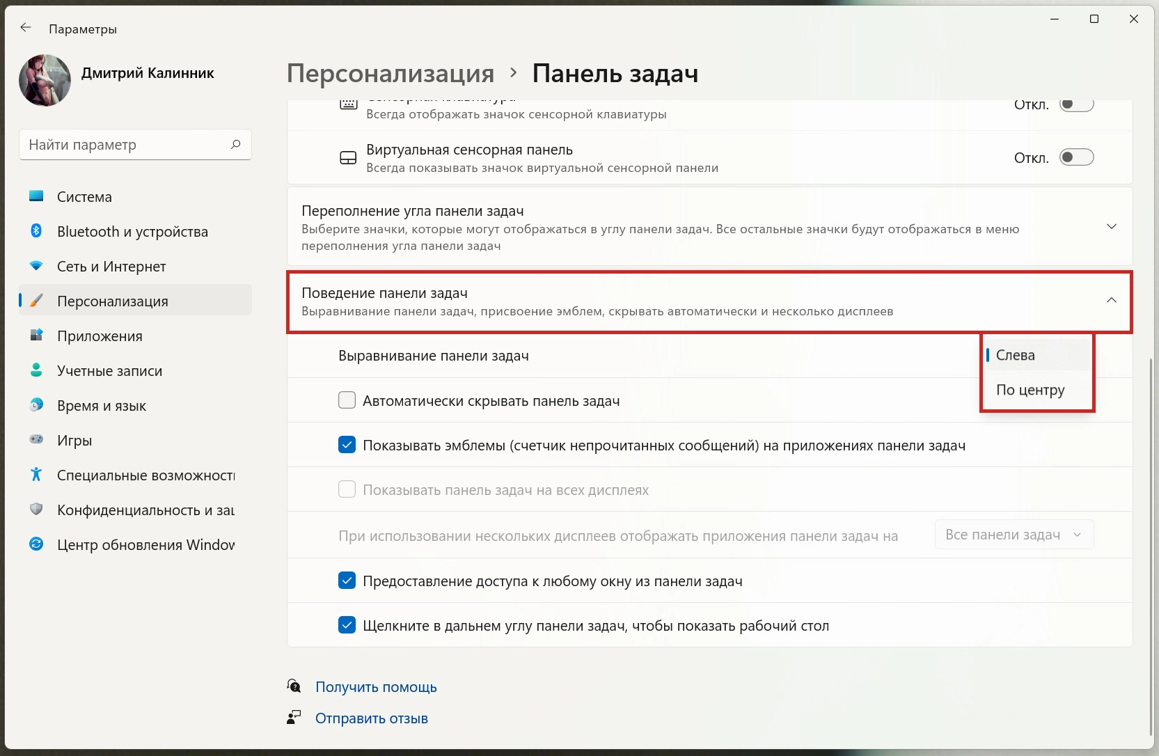 - В параметре «Выравнивание панели задач», в раскрывающемся меню выберите «Слева».