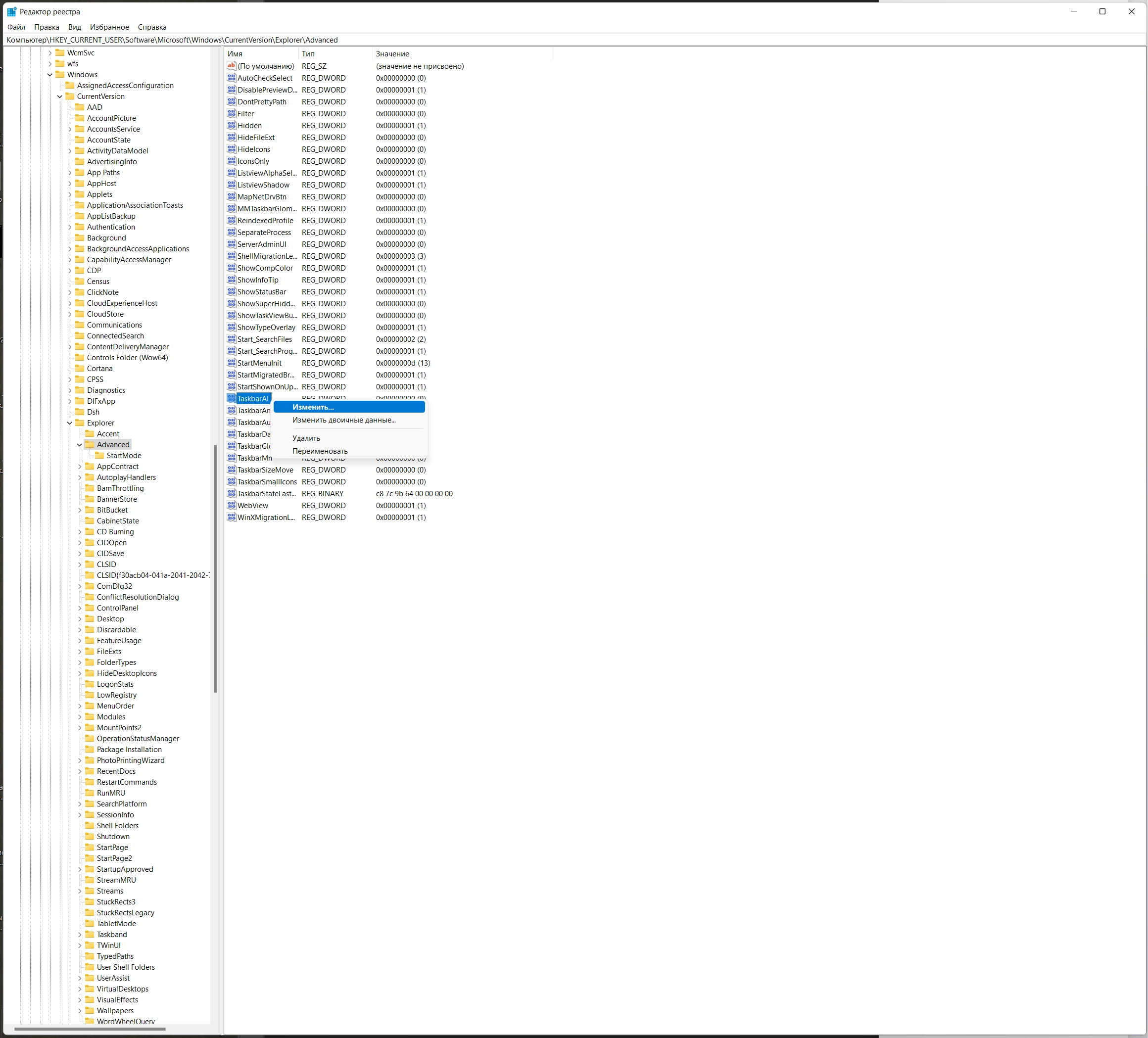 - Щелкните по параметру «TaskbarAl» правой кнопкой мыши.