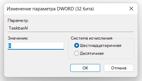 Значения параметра «TaskbarAl», влияющие на параметры выравнивания панели задач: