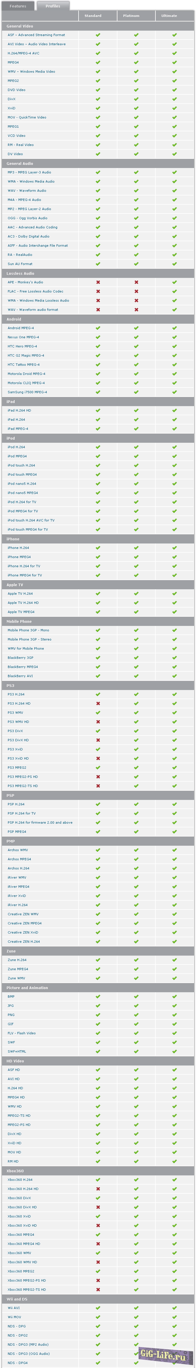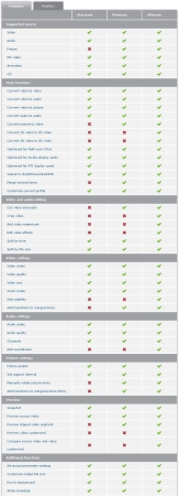 - Оптимизированные профили конвертации - Программа поставляется с оптимизированными и сгруппированными профилями конвертации для широкого ряда мультимедийных устройств. Настраивайте существующие профили и сохраняйте их как свои собственные.