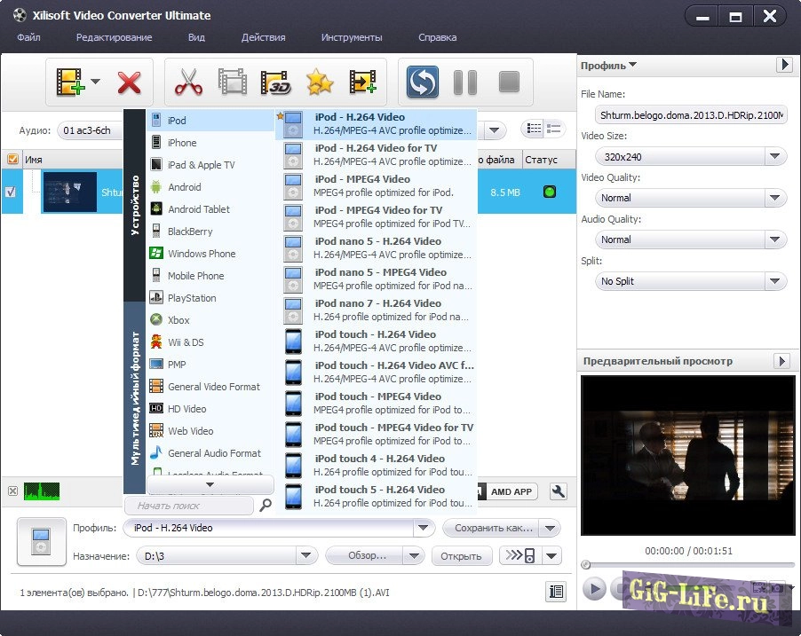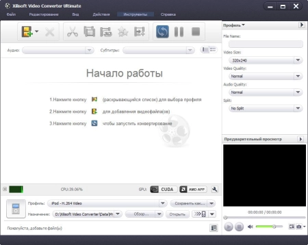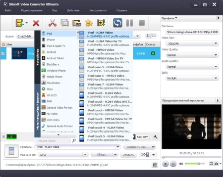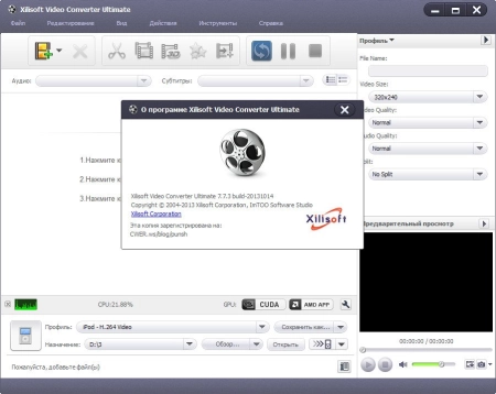 Xilisoft Video Converter Ultimate - мощный и универсальный видео конвертер. Поддерживает большинство популярных видео форматов, в том числе DVD, VCD, SVCD, MOV, RM, AVI, MPEG, MPEG1, MPEG2, MPEG4, WMV, 3GP и других, извлечение аудио из видео в MP2, MP3, AC3, RA, M4A, OGG, AAC и другие форматы, пакетный режим конвертирования, предварительный просмотр во встроенном проигрывателе, выбор и настройка аудио и видео кодеков, настройка параметров конвертирования, простой и удобный интерфейс.