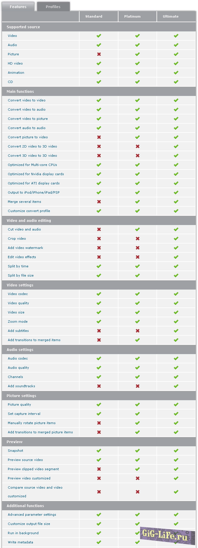 - Видеоконвертер с высокими характеристиками - Поддерживает широкий ряд видеоформатов HD, позволяет вам осуществлять конвертацию между различными форматами HD, такими, как H.264/MPEG-4 AVC, AVCHD Video (*.m2ts, *.mts), Apple TV h.264 720P, MKV, HD WMV и MPEG2/MPEG-4 TS HD Video, а также конвертировать видео из HD в SD.