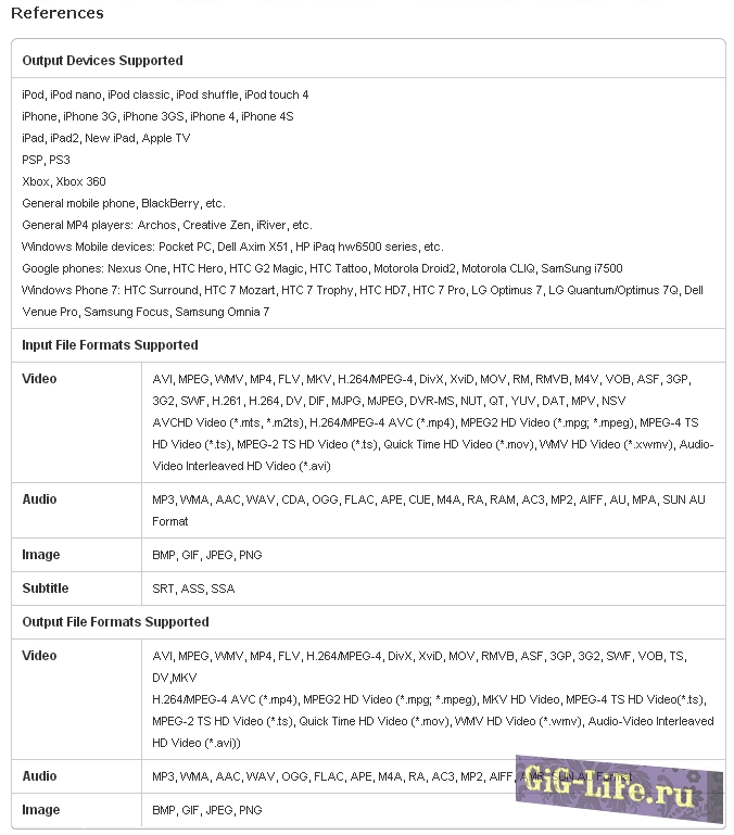 - поддержка MPG, WMV, MP4, 3GP, MOV, RM, DVD, VCD, AVI, ASF и других форматов
