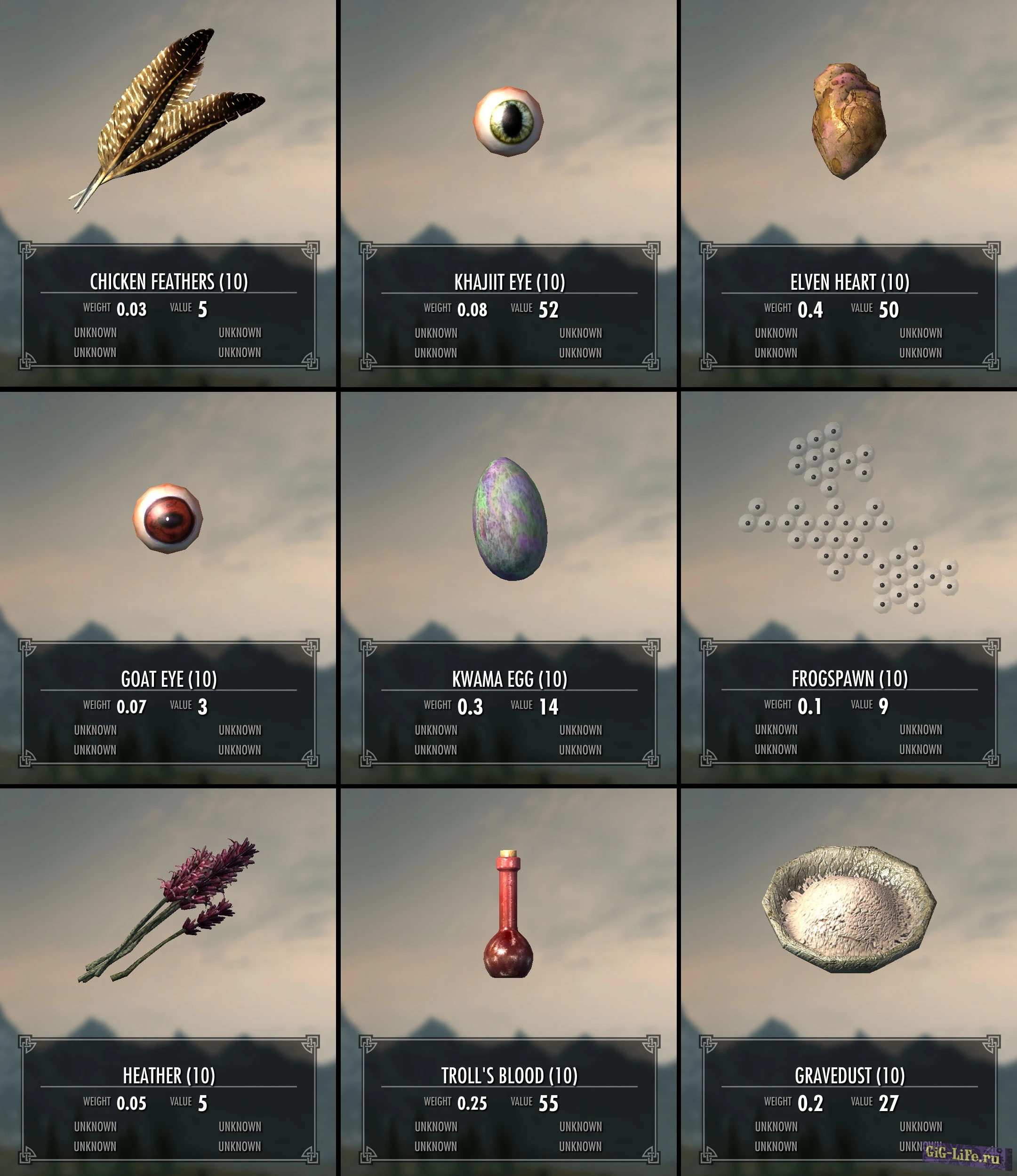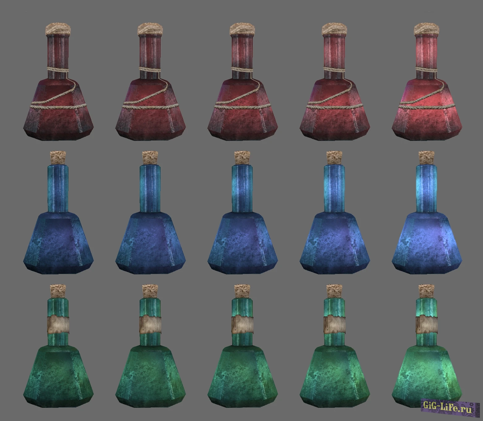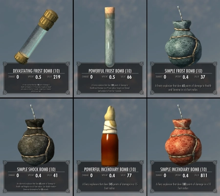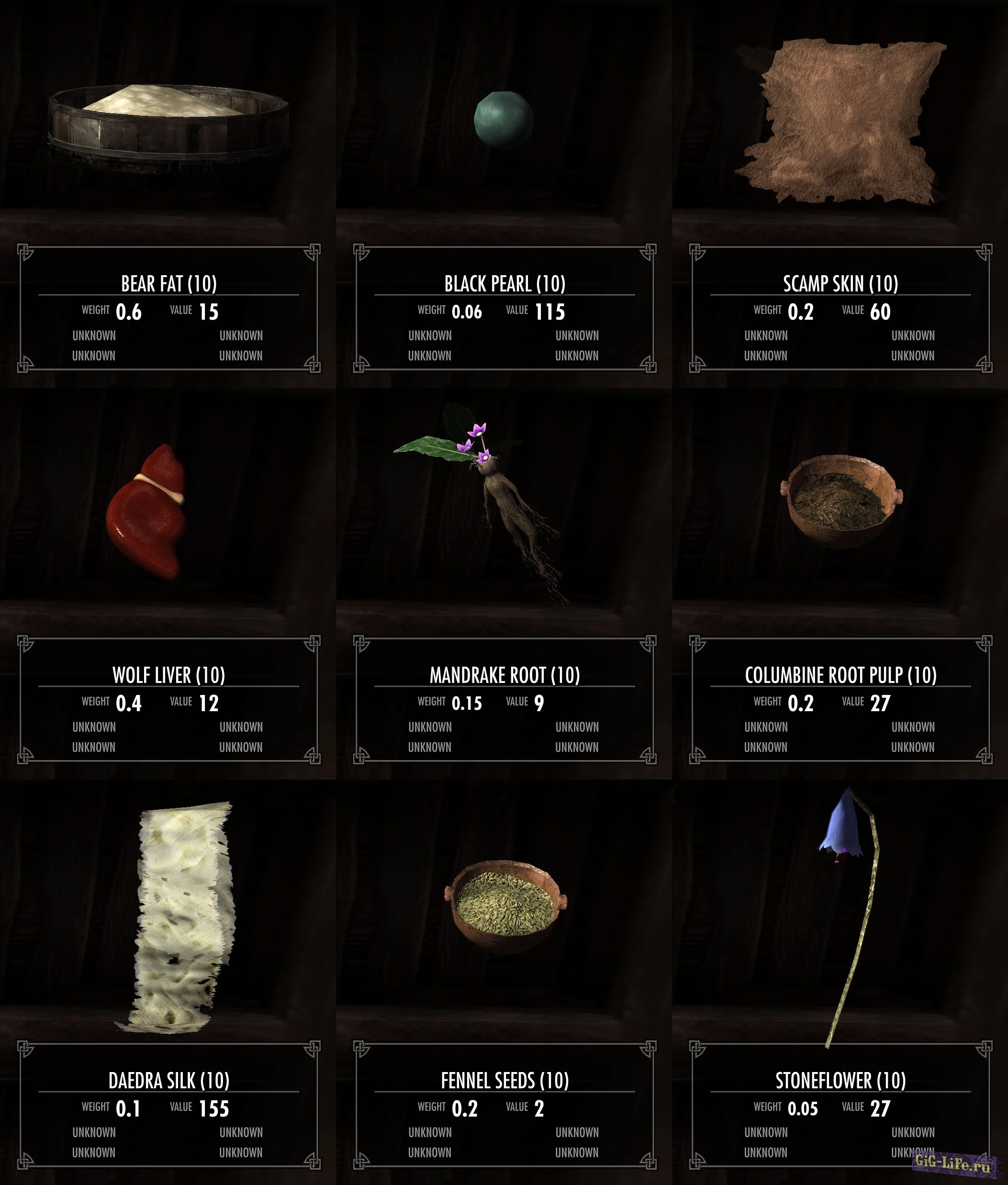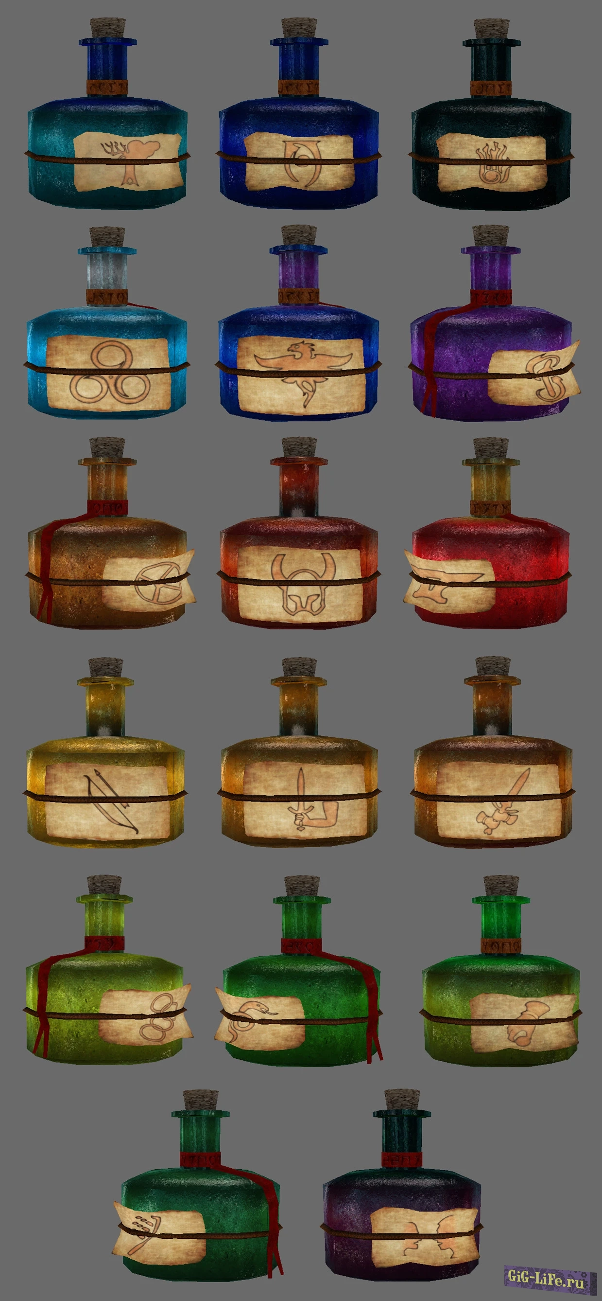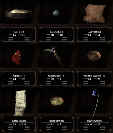- Зелья, созданные игроком, полностью соответствуют по силе, стоимости и названию готовым зельям, найденным в игре.