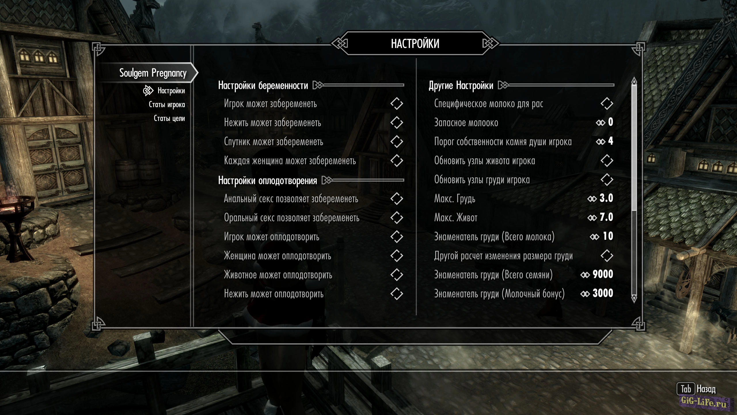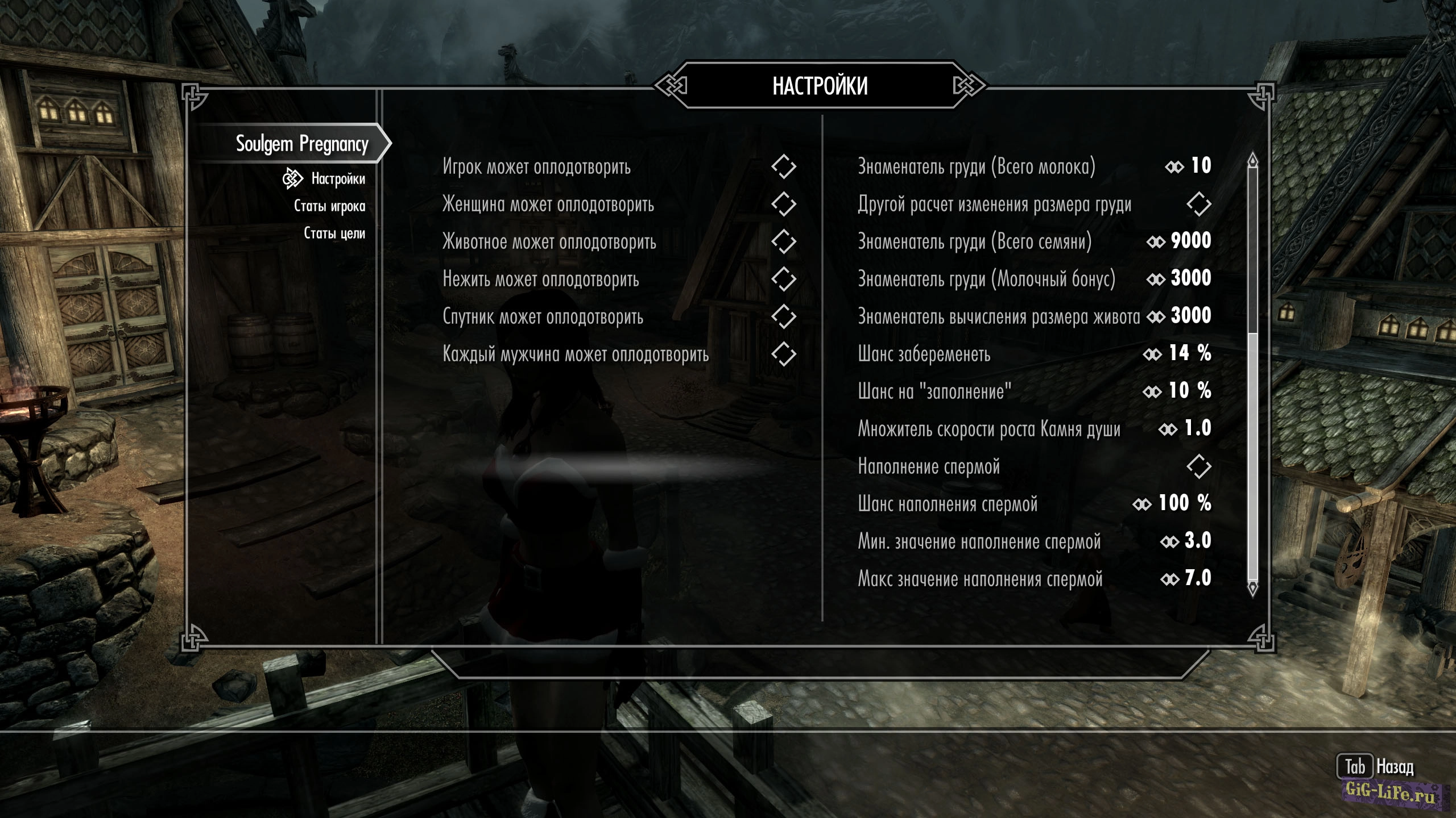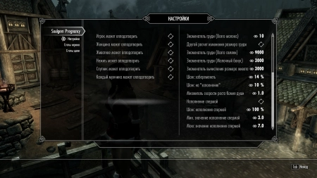 - Может быть несовместимость с модом на беременности, в настройках можно включить\отключить беременность для отдельных npc или через заклинание для любого npc.