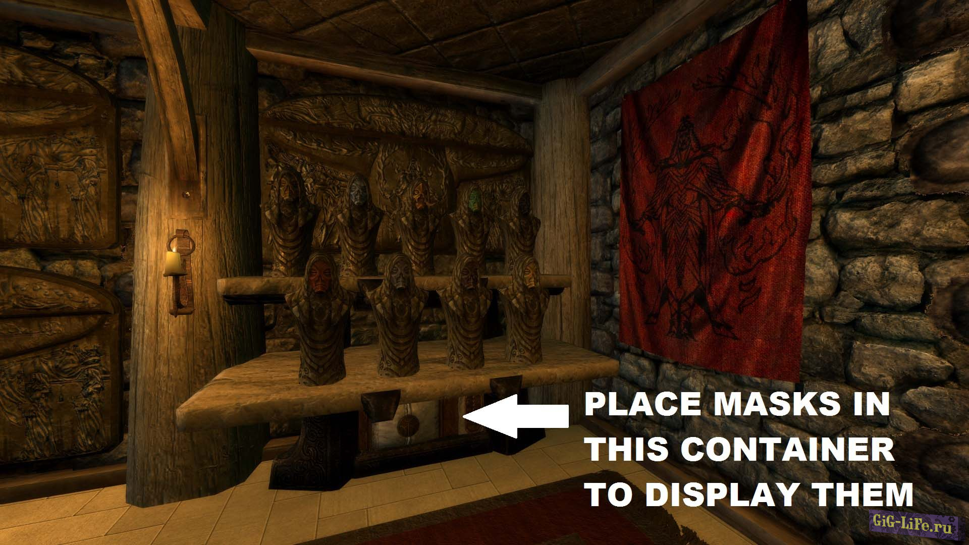 - Трофейная комната - Комната трофеев может быть создана в подвале на верстаке в категории "Разное". Существуют три различных витрины, которые можно создать, каждая из которых имеет два варианта. Вы можете создать витрину для уникальных вещей (маски, когти или даэдрические артефакты) или обычную витрину из Hearthfire. Пожалуйста, выберайте обдуманно, прежде чем строить, потому что не получится удалить витрину, когда он уже был сделана. *Для использования пользовательских витрин, поместите соответствующие предметы в контейнер под полкой