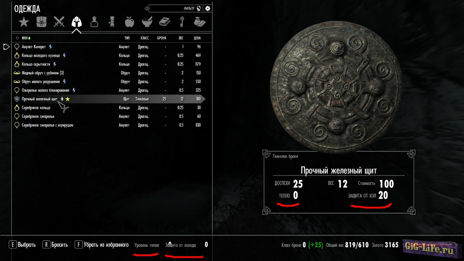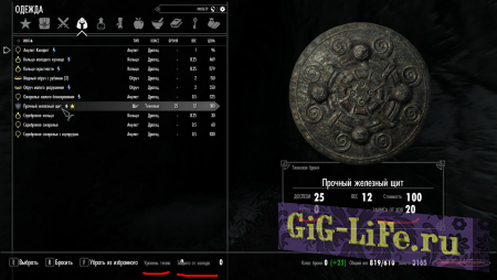 - Ваше общее Тепло и Защита от холода отображаются в нижней части меню инвентаря (при использовании SkyUI 5.1+ и опции аддона: SkyUI 5.1 Add-On for Frostfall 3