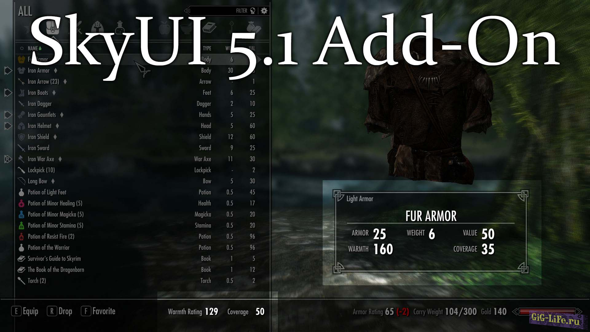 - Опционально - Frostfall SkyUI Add-On - позволит вам видеть значения "Тепло" и "Защита от холода" показывающихся на каждых частях брони в своем инвентаре.