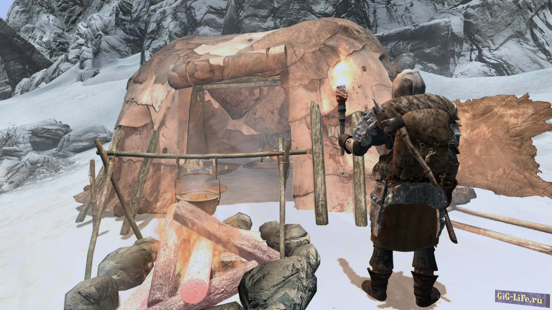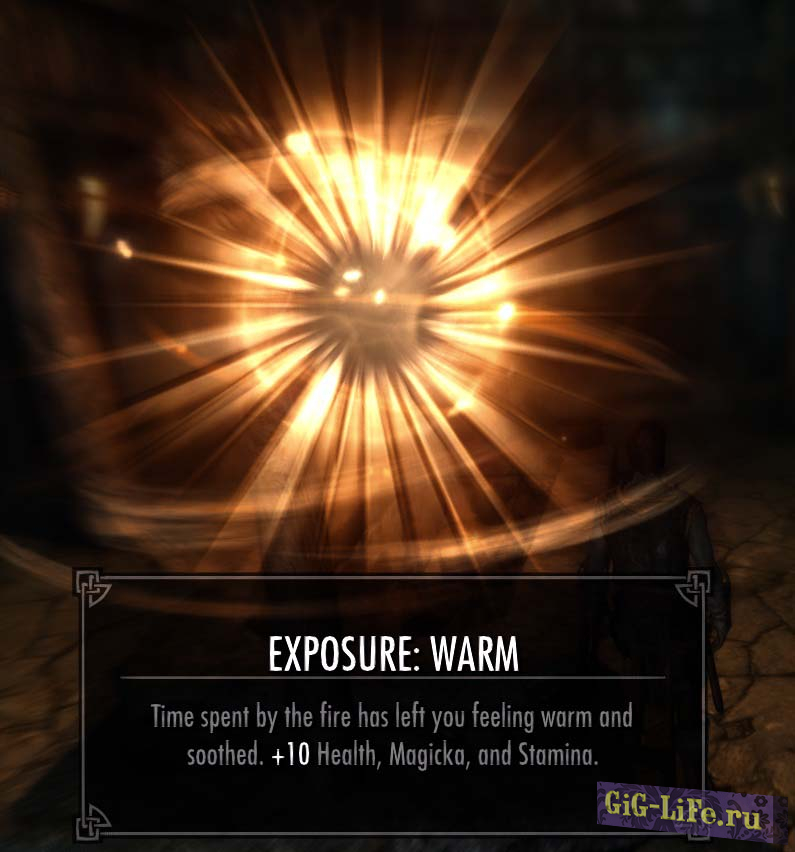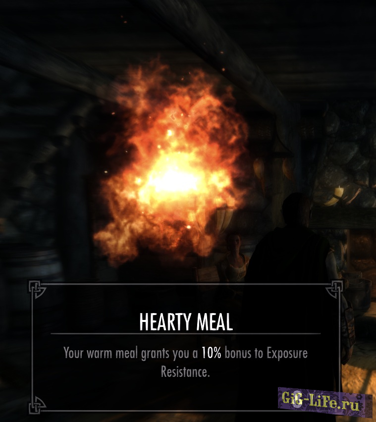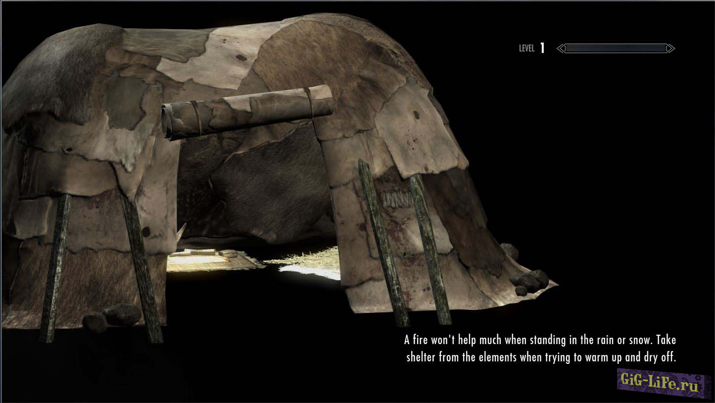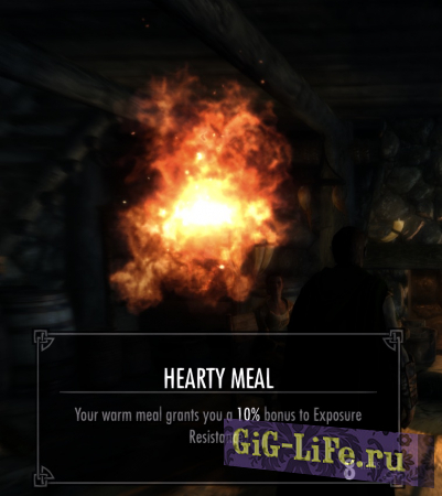 - Чтобы согреться и высохнуть, разведите огонь или войдите в помещение. Во многих домах и тавернах есть камины. Просто встаньте у огня и ваше Переохлаждение и Влажность быстро снизятся.