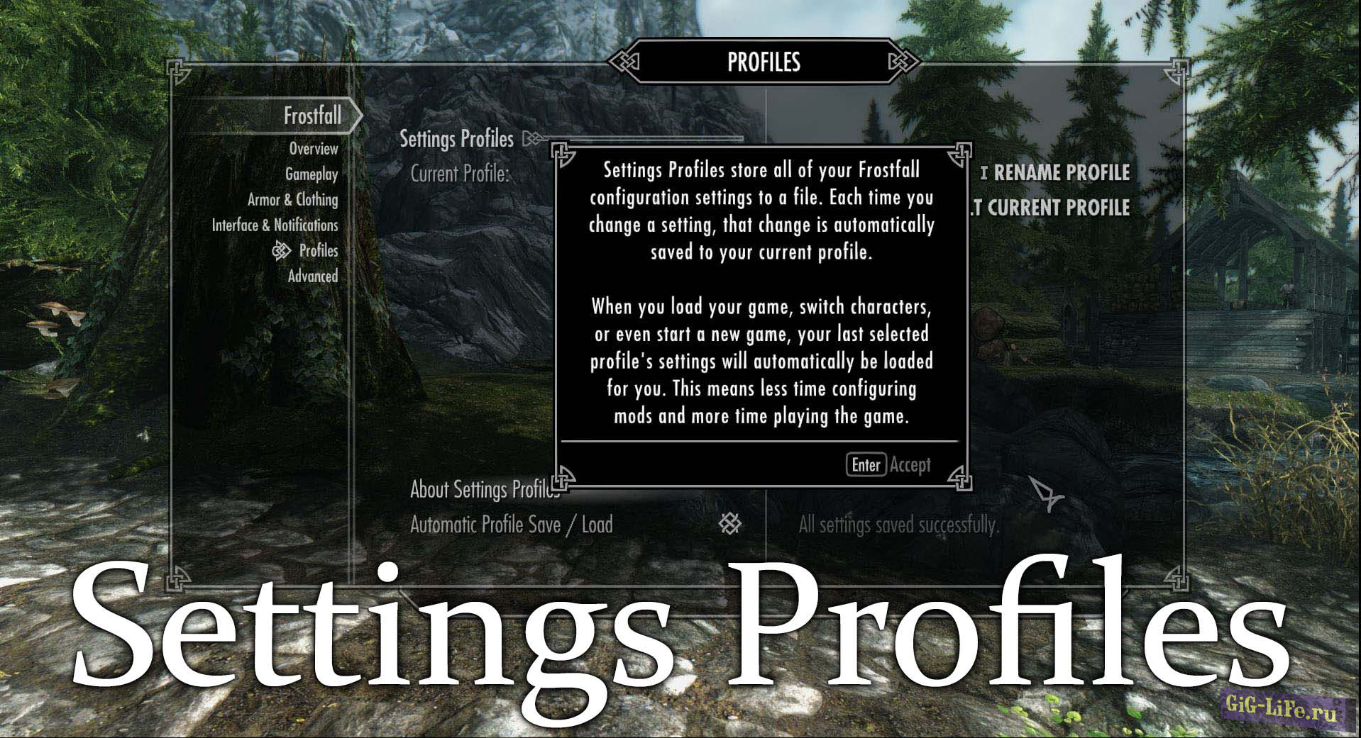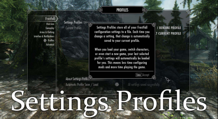 - Все ваши настройки для Campfire и Frostfall сохраняются в настройках профилей. Данные настроек сохраняются в файлы. Они загружаются при смене персонажа и с началом новой игры. Вы можете настроить все необходимые параметры один раз и использовать их в любых сохранениях, т.к настройки загружаются автоматически при запуске игры. Campfire и Frostfall имеют по 10 слотов настроек.
