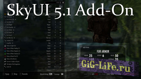 - SkyUI 4.1 или 5.1 (нужен аддон на 5.1, имеется в архиве, ставить обязательно если у вас SkyUI 5.1 и выше)