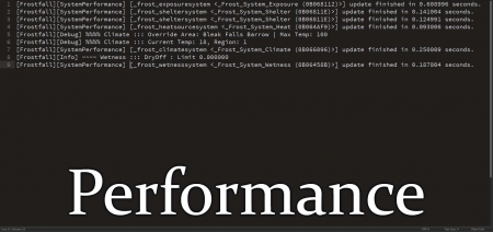 - Frostfall теперь работает гораздо быстрее. Если раньше у вас были проблемы с запуском Frostfall, то новая версия подарит вам гораздо лучшее впечатление. Также следует ограничить количество других модов, воздействующие на производительность.