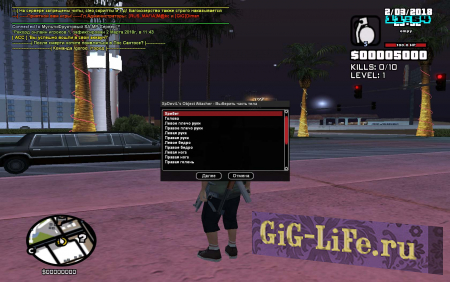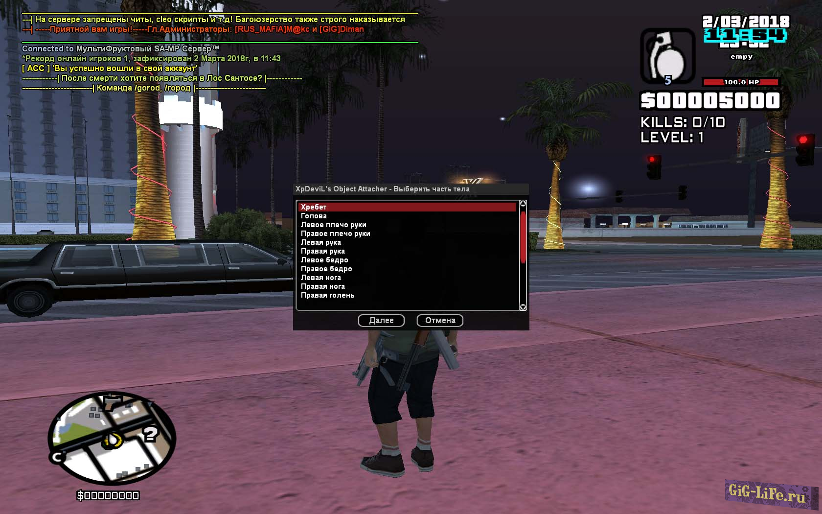 Установив данный фильтерскрипт появится возможность при помощи команды прикрепить любой объект (несколько объектов) на скин игрока.