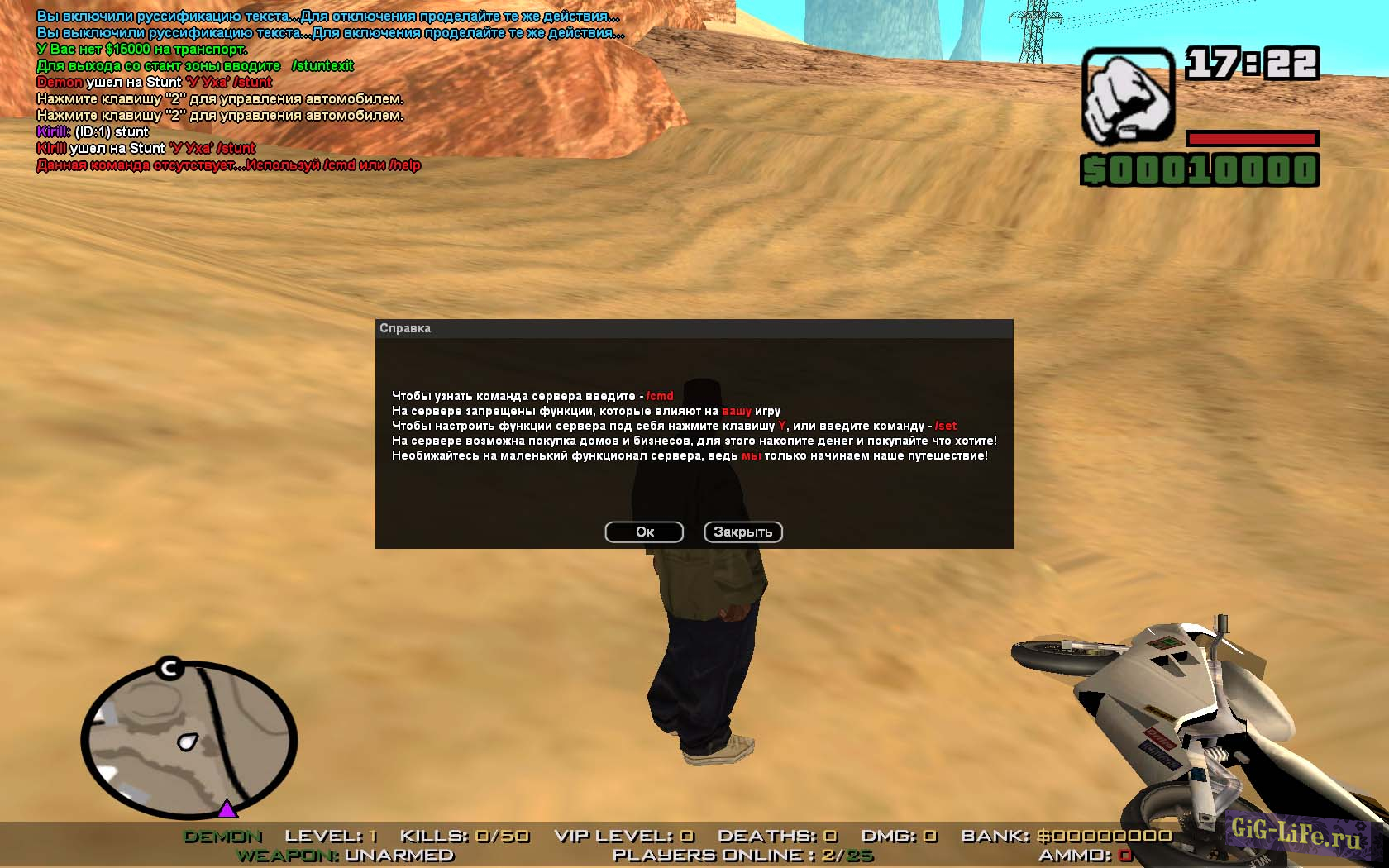 Развлекательно-увлекательный мод с множеством "вкусняшек" и различными модификациями. Сервер на многофункциональную тематику, можно отдохнуть, пострелять, приобрести владения или воцариться на гору славы и купаться в ней.