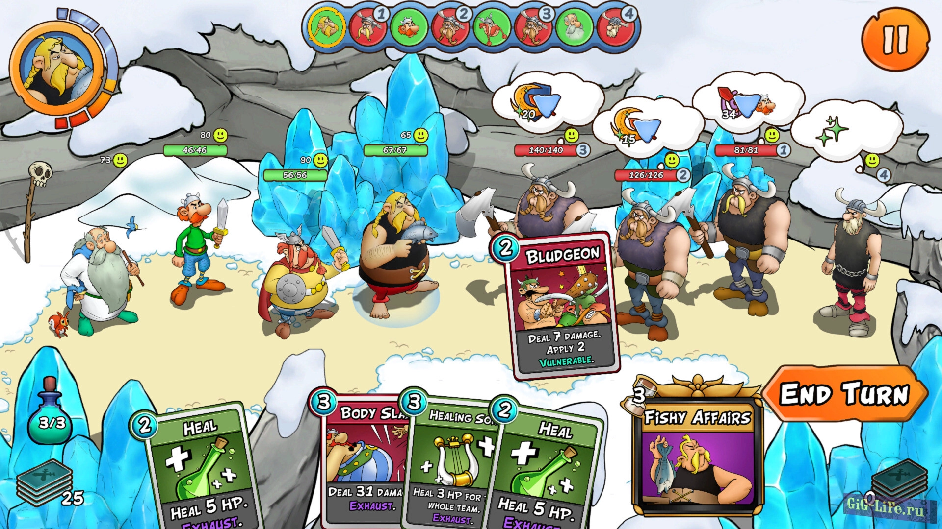 Каждая карта колоды усиливает вашу стратегию. Например, вы можете наносить врагам много урона от удара менгиром или исцелять героев c помощью зелий Панорамикса! Вам придется адаптироваться к каждому раунду, принимать правильные решения и создавать неожиданные и разрушительные комбо. К примеру, вы можете отправить в бой легендарный дуэт Азбукиведикса и Автоматикса.