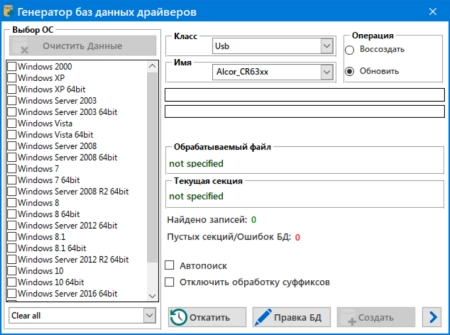 Генератор БД драйверов работает теперь в полуавтоматическом режиме. Настоятельно рекомендую при создании БД отмечать в списке ОС для каких версий предназначен тот или иной inf-файл драйвера. Процедуру создания баз для одного драйвера зачастую приходится повторять несколько раз. Теперь сложнее, но зато более точные результаты.