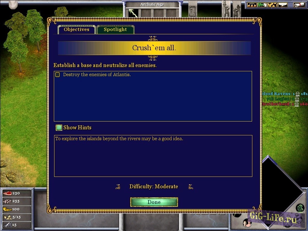 В игре Age of Mythology: The Titans у вас есть возможность установить карту, на которой вы начнете сражение с юго-восточной части и будете сражаться с тремя противниками. Вы можете решить, начинать строительство базы сразу же или постепенно развивать ее.