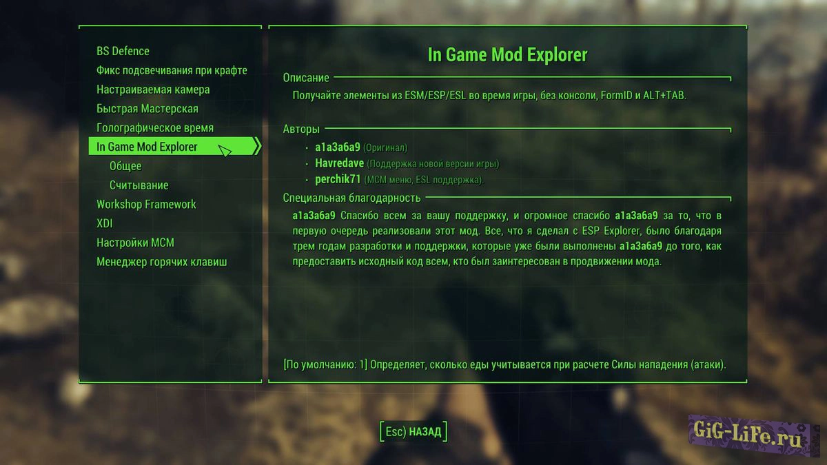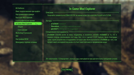 Мод IN-GAME ESP Explorer для Fallout 4 предоставляет возможность легко доставать любые предметы из установленных модов без необходимости изготавливать их или искать в мире игры.