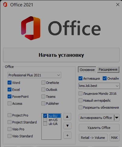 - helper.exe /S /INSTALL /PRO /WORD /EXCEL /POWERPOINT /VISIOSTD /LANG=RU-RU /KMS