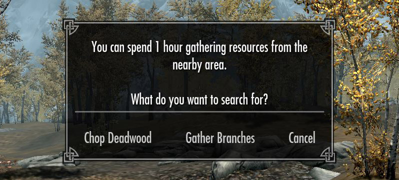 Выбрав одну из этих опций, пройдет 1 час игрового времени, после чего предметы появятся у вас в инвентаре. Если у вас есть компаньоны, то изредка они буду собирать для вас ветки и рубить сухостой.