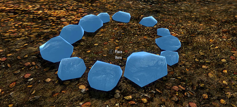 - После установки кольца костра, вы должны нажать на кольцо (как и в варианте "Реалистичный режим" размещения костра). Крафт интерфейс позволит вам построить костер всего в один шаг, ударив камнем или с помощью магии огня (выбор топлива и трута пропускается и сразу будет потрескивание огня).