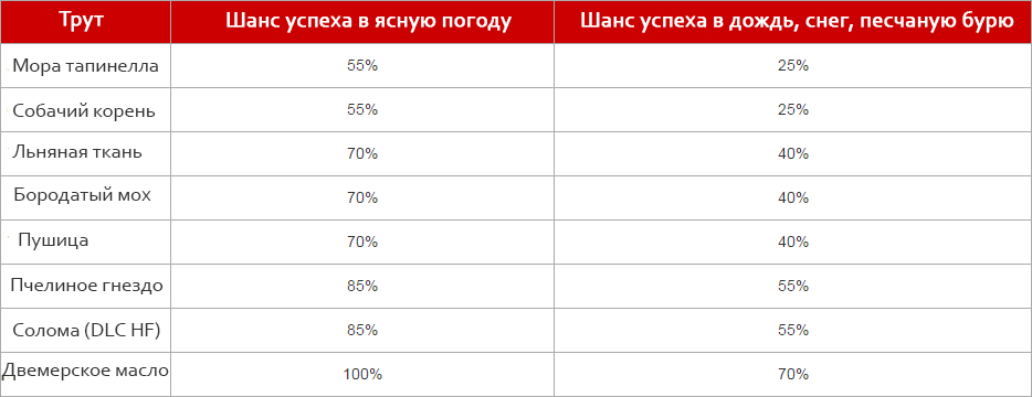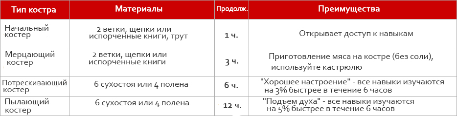 Шанс на разведение огня в любых погодных условиях может быть увеличен с изученным навыка "Искусство огня". Будьте внимательны: костер горит всего 1 час! Будьте уверены, что вы запаслись достаточным количеством топлива и развели большой огонь, иначе трут и топливо будут потеряны и вам придется начинать все сначала. Лучше заранее иметь достаточно топлива для хотя бы мерцающего костра, прежде чем начинать разводить огонь. Таким образом, ваш костер не потухнет до того, как вы раздобудете топливо. - Разведение костра (Опционально)