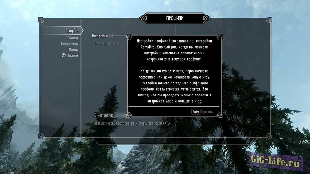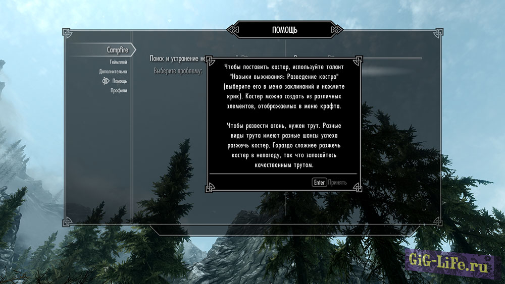 - С некоторыми ENB (Иногда на экране может появляться чернота, это незначительный визуальный глюк, связанный из-за определенных событий в Campfire)