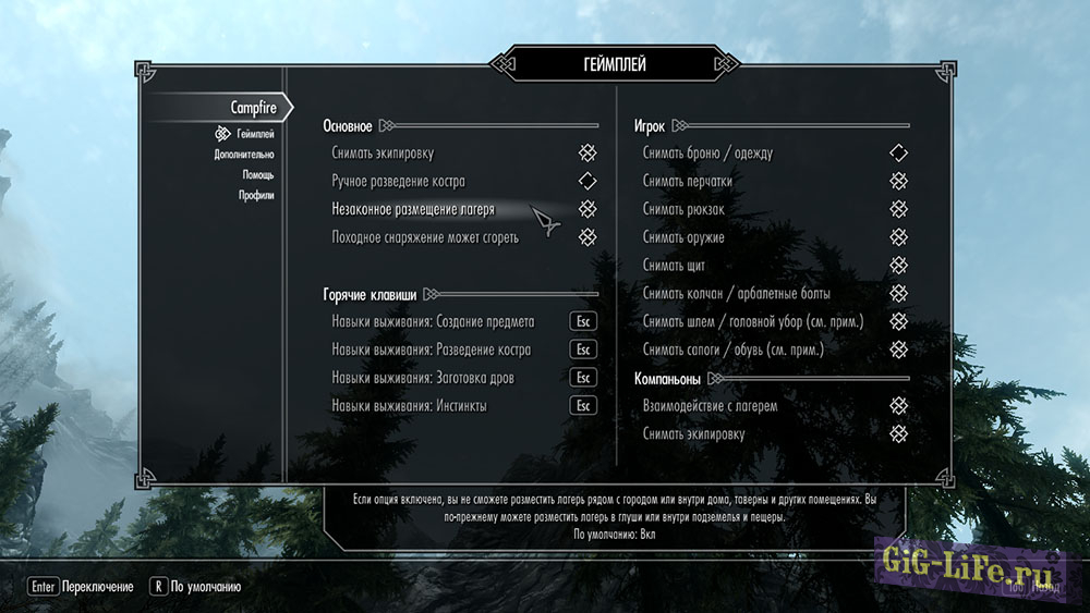 - С другими модами на лагерь (Camping Kit of the Northern Ranger, LtMattMoo's Camping и д.р) (Мод добавляет новые функции, похожие на те, что есть в этих модах, чтобы избежать путаницы, не используйте их вместе с этим модом)