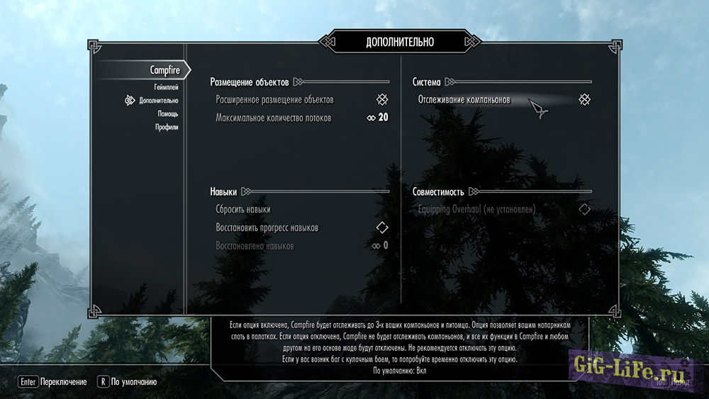 - Если вы сделали чистку сохранения или удалили Campfire, то ваш прогресс навыков будет утерян. Чтобы его восстановить откройте MCM меню (SkyUI) или примените талант "Настройки: Костер", выберите Дополнительно > Навыки > Восстановить прогресс навыков.