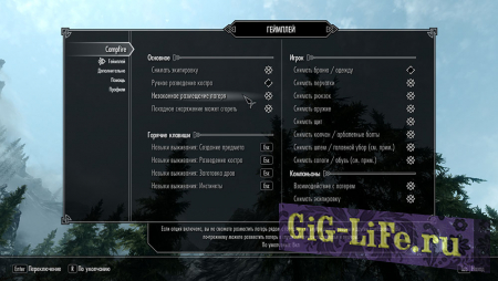 - Dual Sheath Redux (Иногда можно увидеть снаряжение для лагеря как на вашем персонаже так и вокруг него. Глюк происходит только тогда, когда персонаж спит или сидит в палатке. Отключите опцию "Снимать экипировку", чтобы избежать этой проблемы.)