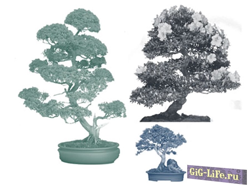 Кисти для программы фотошоп, включающие уникальные кисточки с изображением японских бонсай. На скриншоте вы можете увидеть, как использовать эти удивительные кисти в деле.