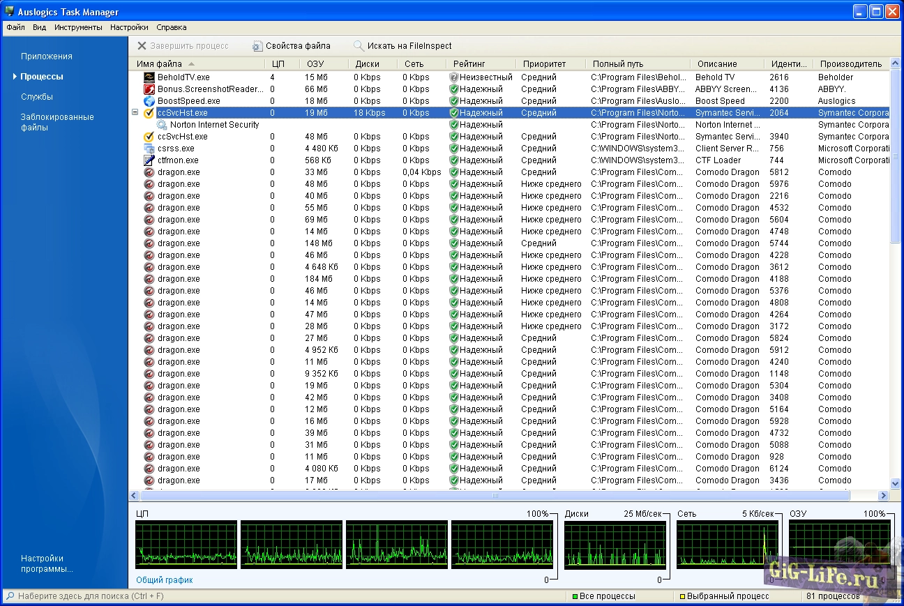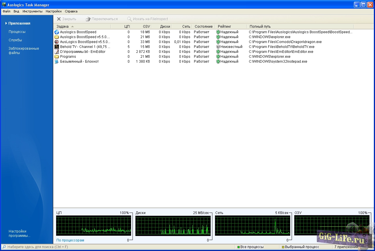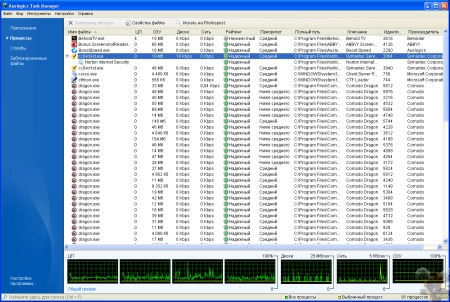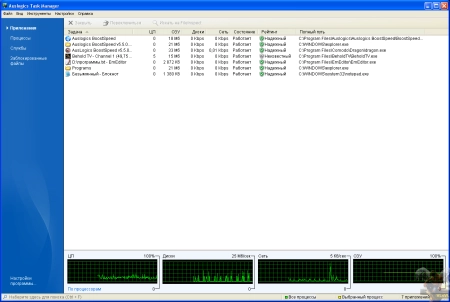 - С помощью этой утилиты Вы сможете контролировать уровень загрузки процессора, памяти и жесткого диска как в общем, так и каждой программой или процессом в отдельности. Кроме того, Task Manager отображает, какие из процессов могут быть небезопасными для Вашего компьютера, и позволяет ускорить любой процесс или приложение за счет перераспределения системных ресурсов.
