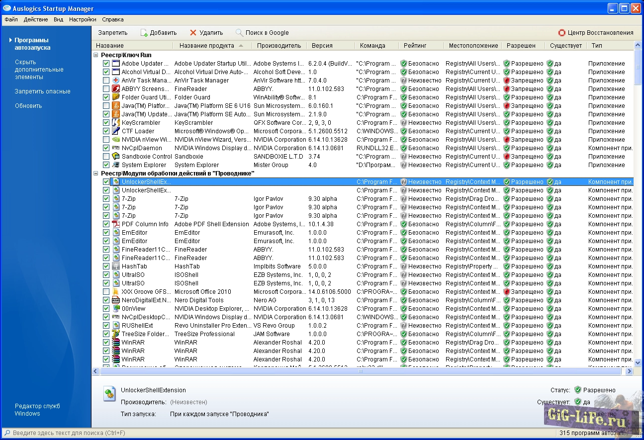 - Показывает все программы, которые запускаются автоматически при загрузке Windows. Этот инструмент позволяет с легкостью управлять списком автозапуска, добавляя или удаляя программы. Уменьшение количества программ автозапуска уменьшает время загрузки Windows и освобождает системные ресурсы. Вместо полного удаления какой-либо программы автозапуска, Вы также можете ее временно отключить.