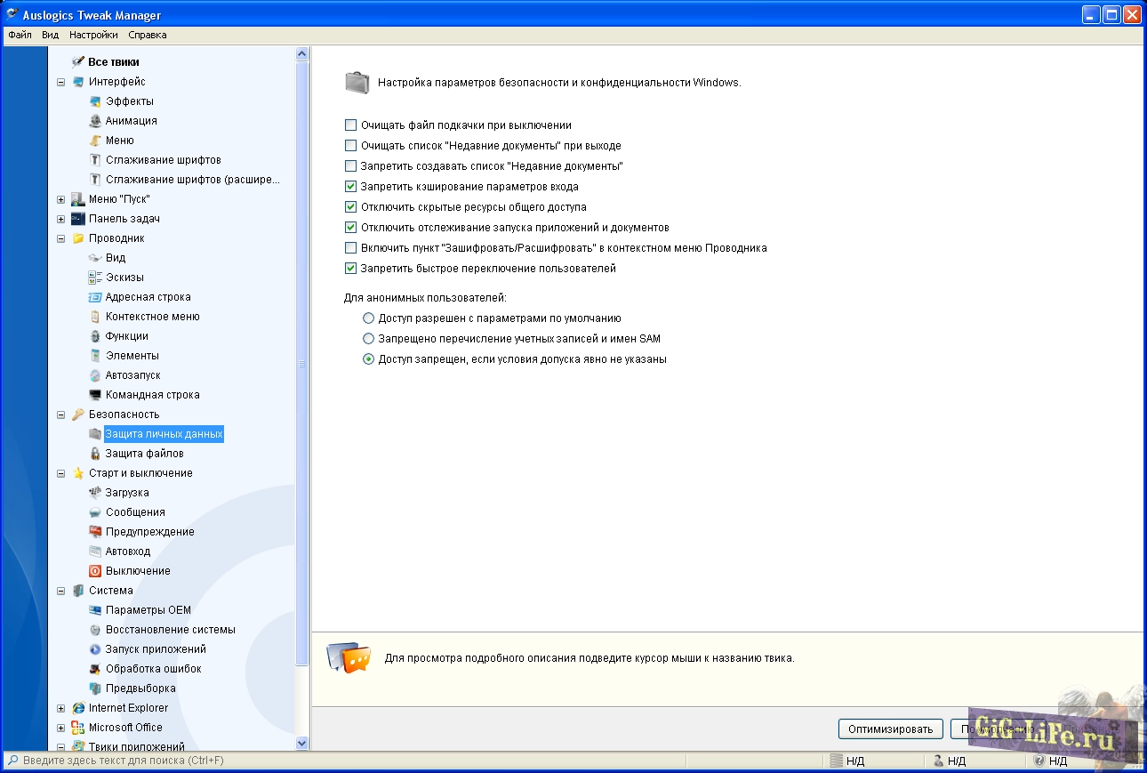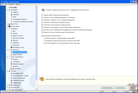 - Этот инструмент позволяет изменять сотни настроек Windows, Интернет-браузеров, e-mail и чат программ. Например, Вы можете настроить визуальные эффекты Windows, ускорить работу браузеров и улучшить безопасность системы. Каждая настройка имеет рейтинг, показывающий влияние этой настройки на работу компьютера. Кроме того, программа отображает подробное описание для каждой опции.