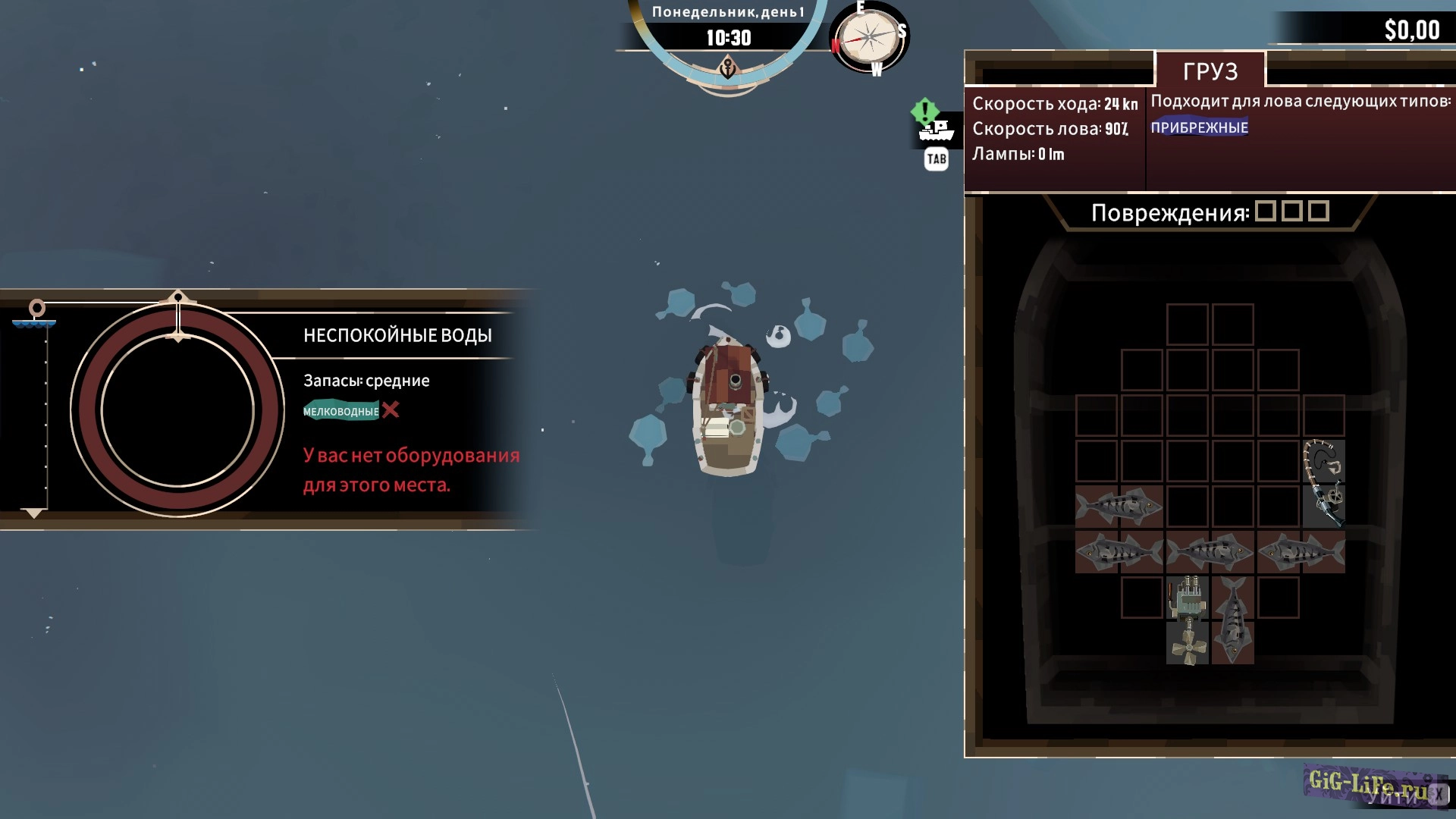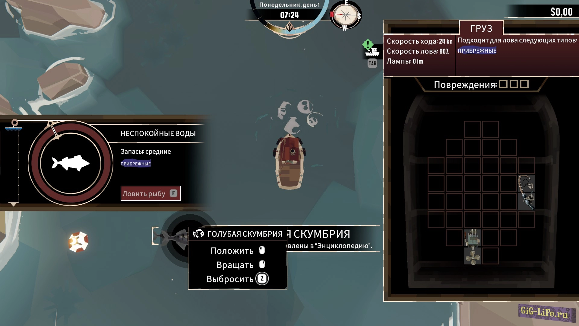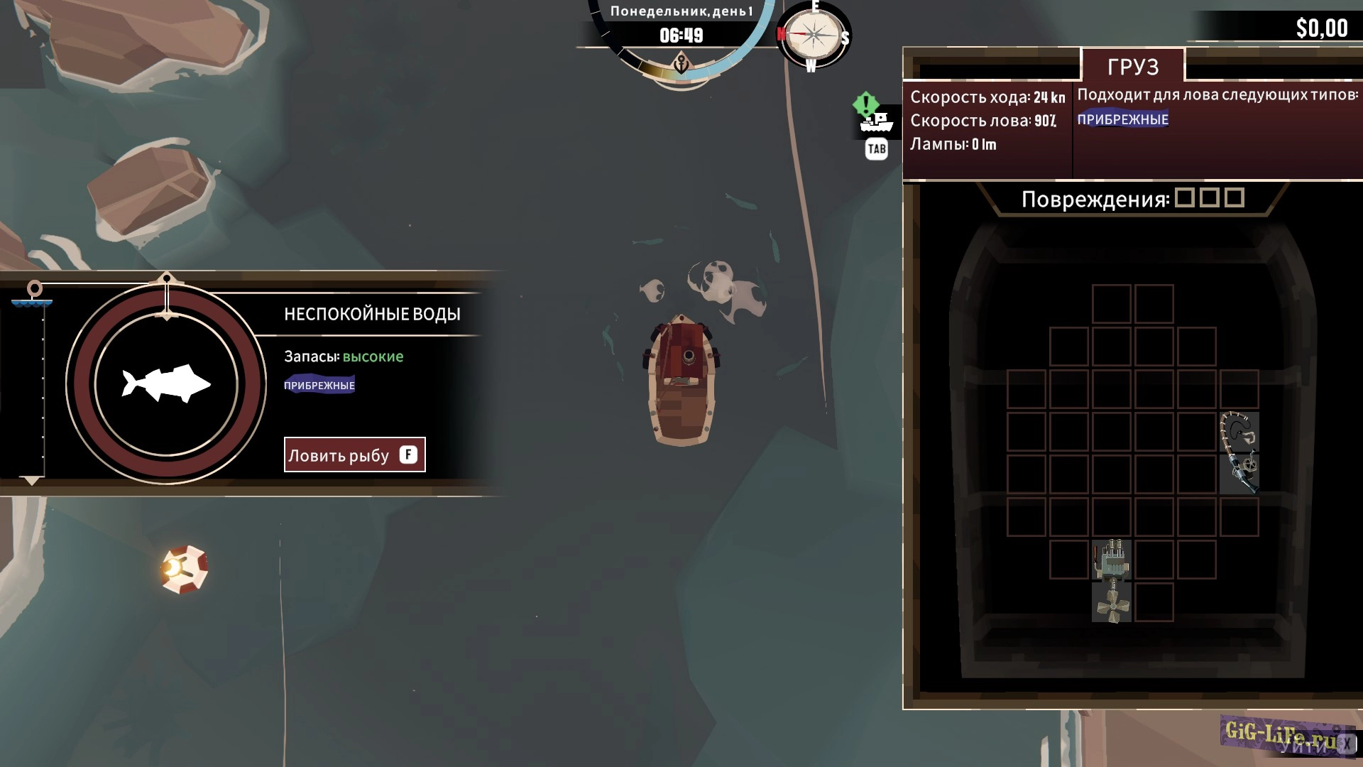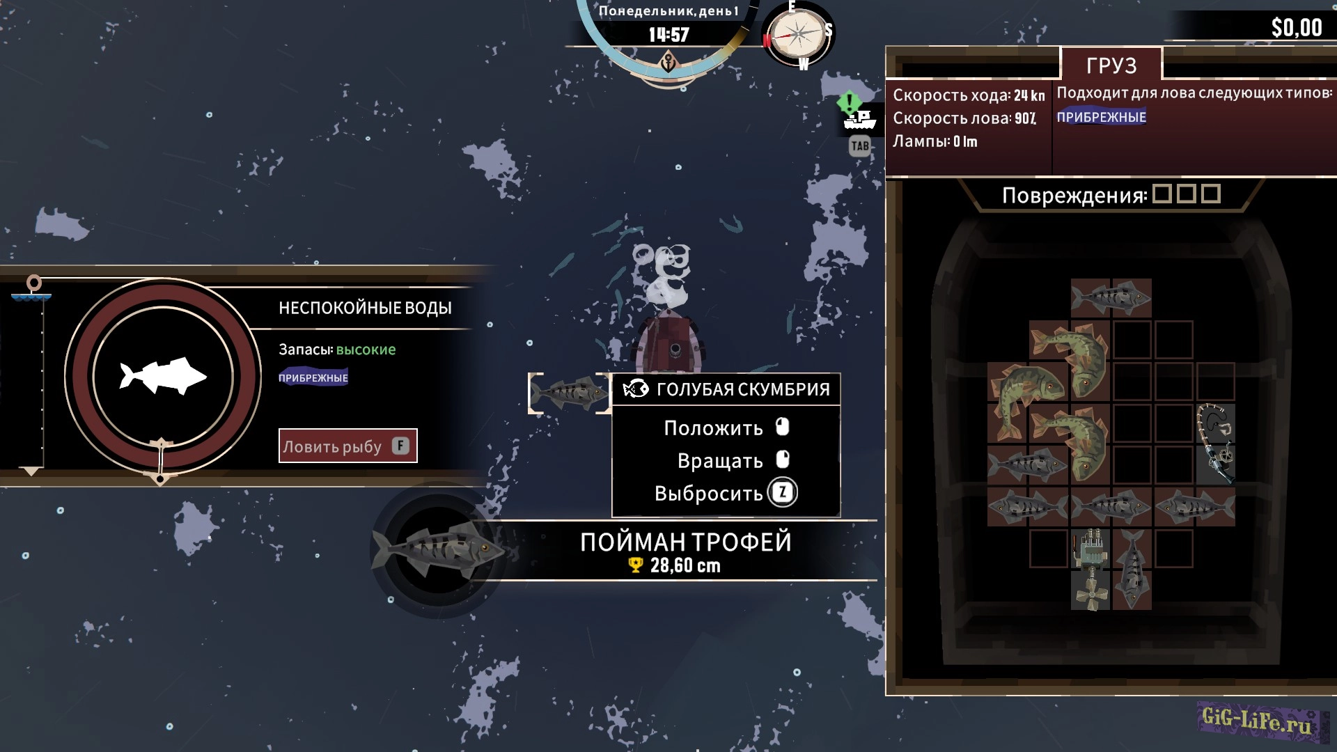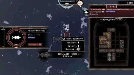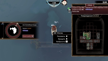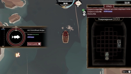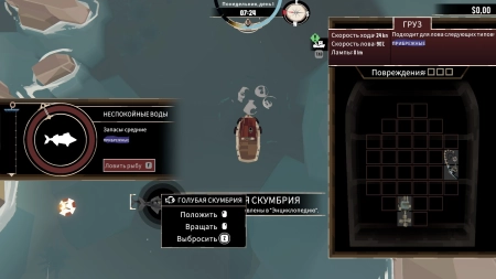 Игра начинается, как обычная рыбалка: ваш корабль, точки для ловли рыбы, управление WSAD, прибытие на место, активация рыбалки с помощью клавиши F и запуск мини-игры, где важно нажимать F в нужный момент, чтобы попасть в зеленую зону. Улов рыбы нужно аккуратно укладывать в трюм, похоже на игру в тетрис.