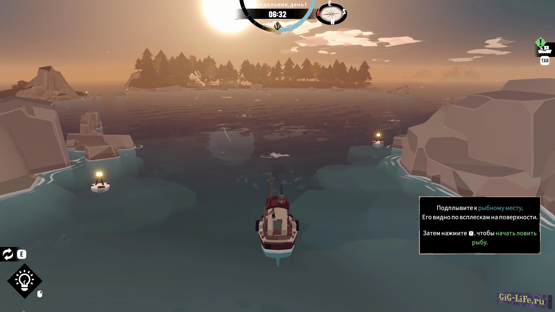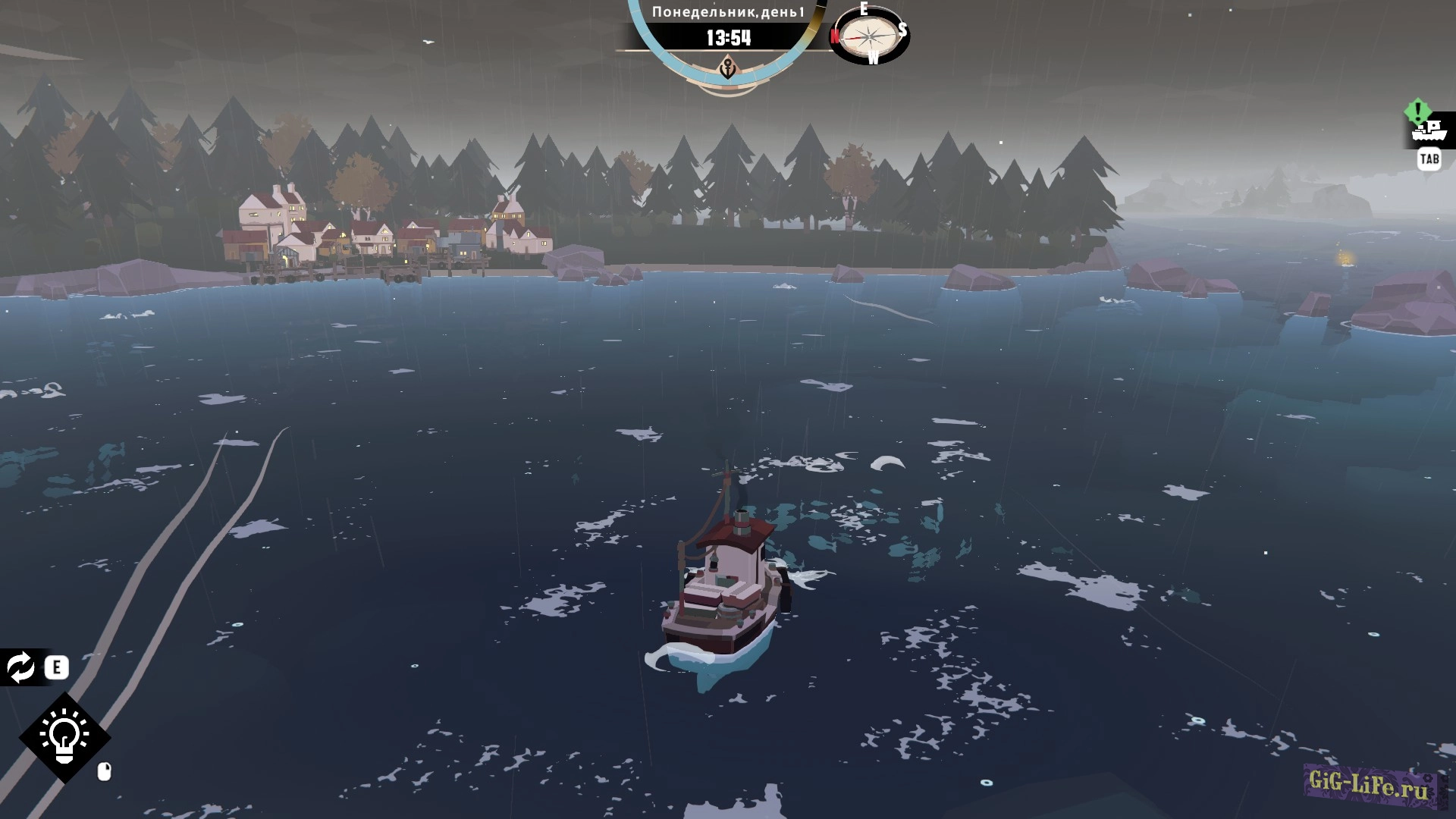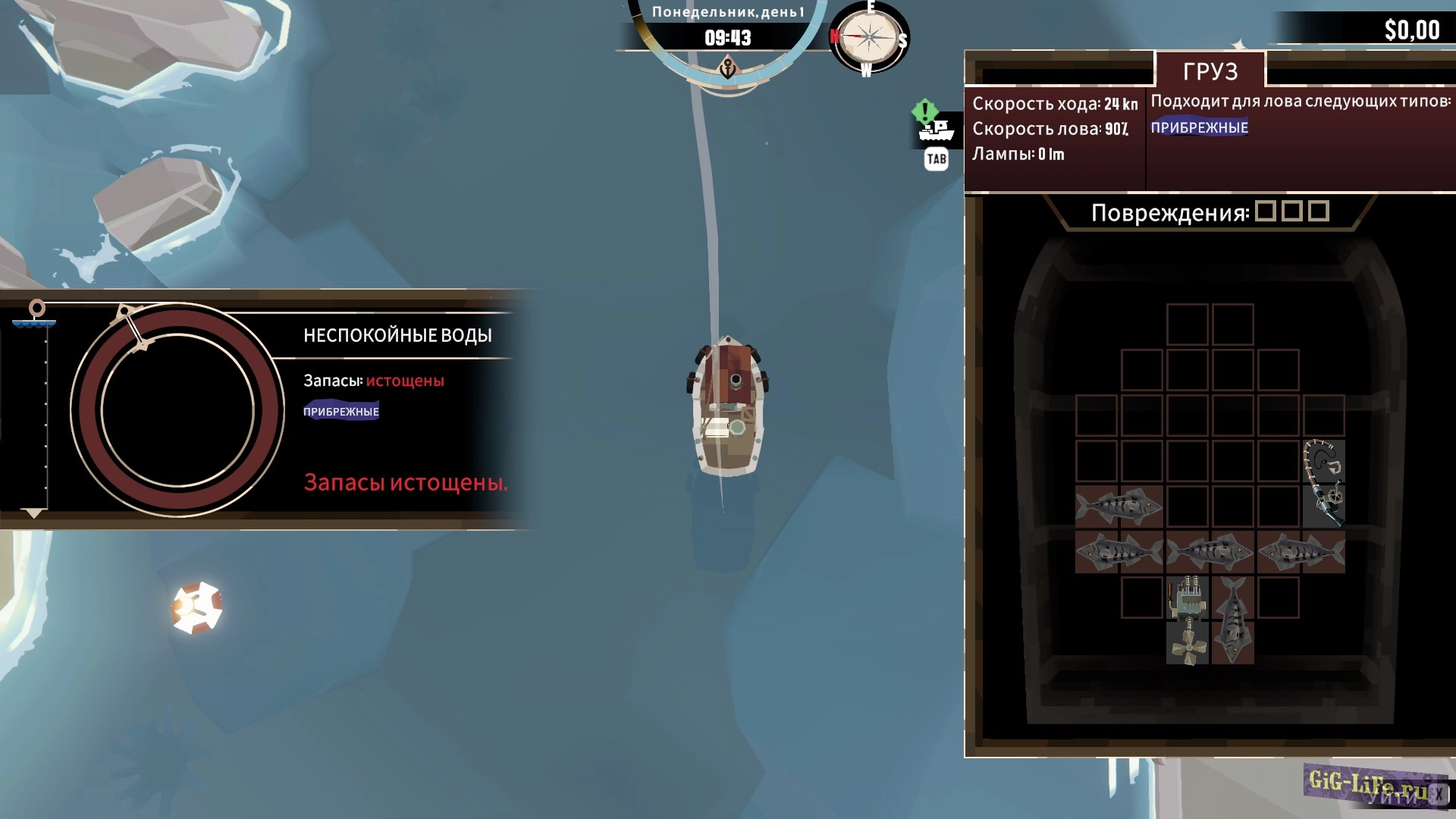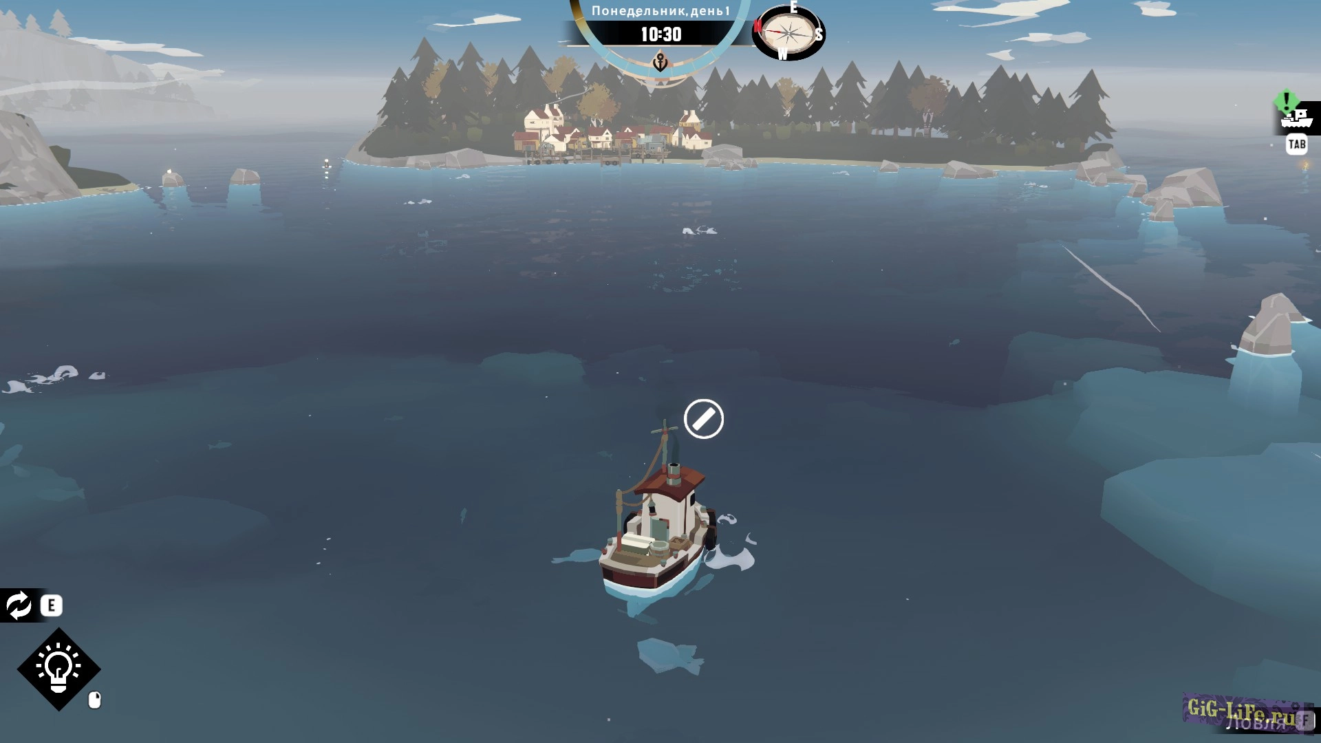Игра начинается, как обычная рыбалка: ваш корабль, точки для ловли рыбы, управление WSAD, прибытие на место, активация рыбалки с помощью клавиши F и запуск мини-игры, где важно нажимать F в нужный момент, чтобы попасть в зеленую зону. Улов рыбы нужно аккуратно укладывать в трюм, похоже на игру в тетрис.
