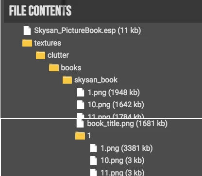 - Picture Book of Skyrim: PicturebookCover1.dds, PicturebookCover1_n.dds, PicturebookCoverBack1.dds, PicturebookCoverBack1_n.dds;
