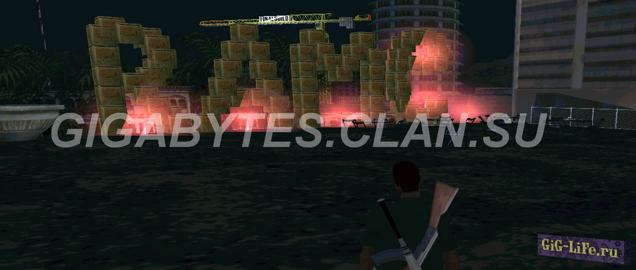 На верхней площадке, возле склада, размещена огромная надпись "9 МАЯ" из ящиков. На самой площадке находится клуб с различными предметами: