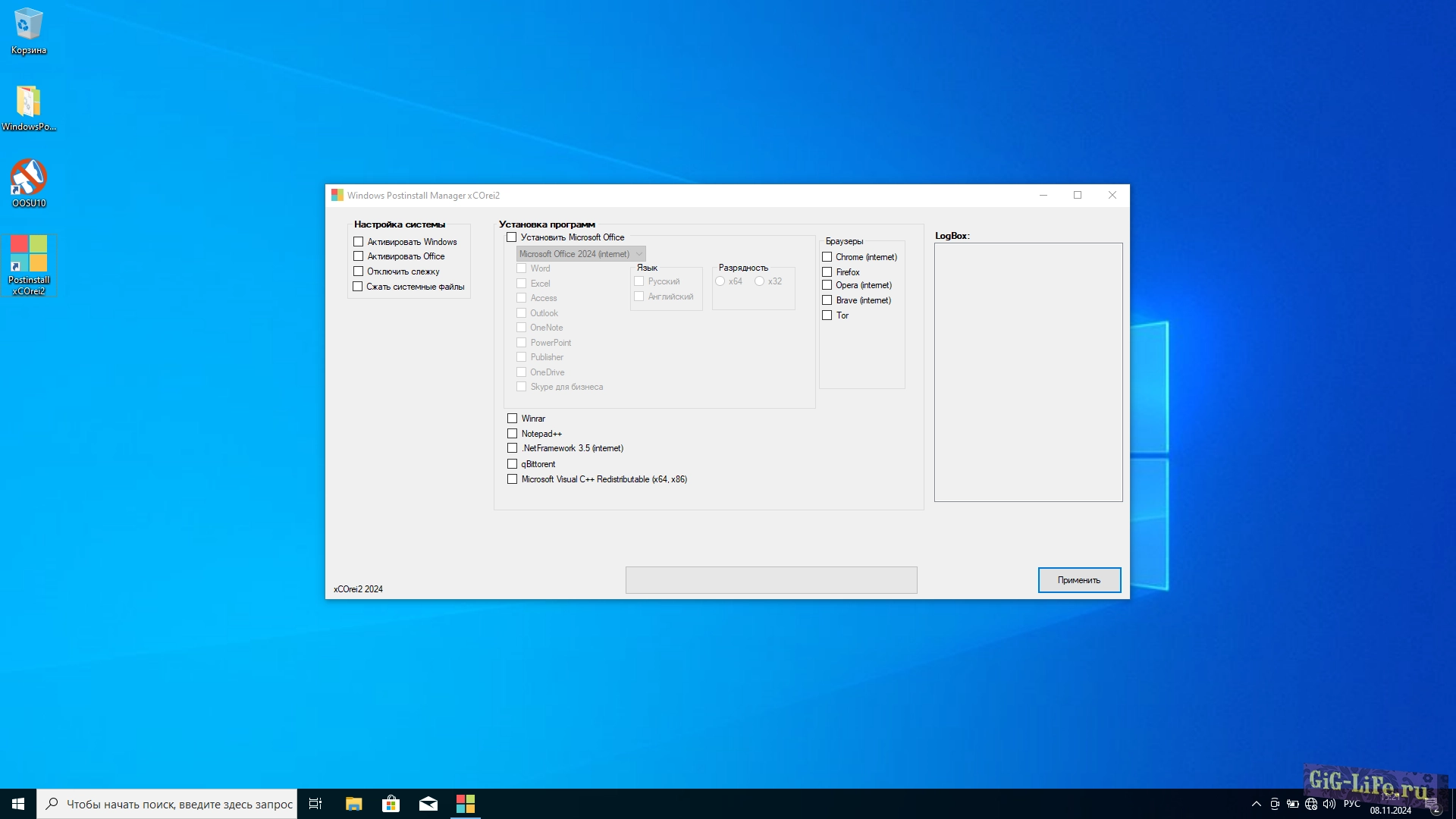 В сборку включены последние обновления, а также удалены некоторые ненужные приложения и те, которые могут перегружать систему. После установки вы можете дополнительно настроить операционную систему с помощью «Windows Postinstall Manager xCOrei2». Система не была в режиме аудита.