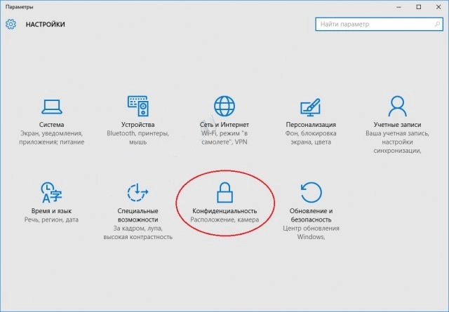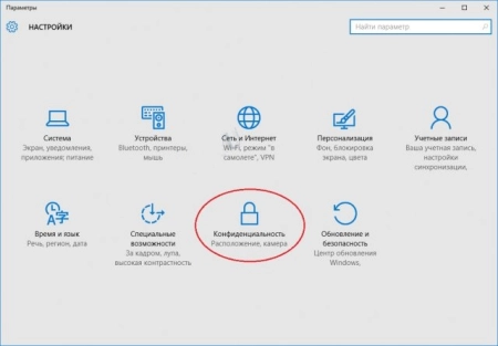 - Прокрутите список доступных параметров и найдите раздел «Конфиденциальность».