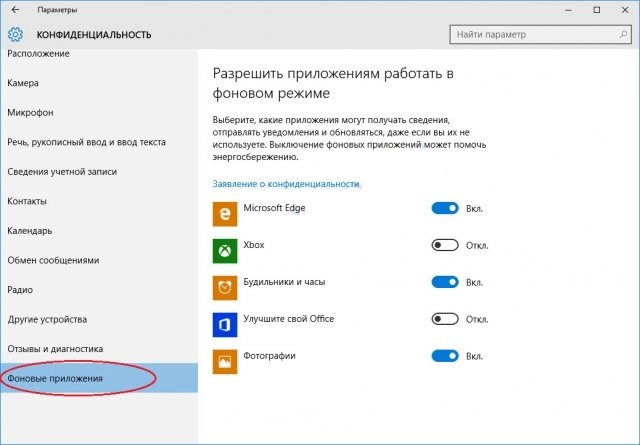 - В разделе «Конфиденциальность» найдите пункт «Фоновые приложения».