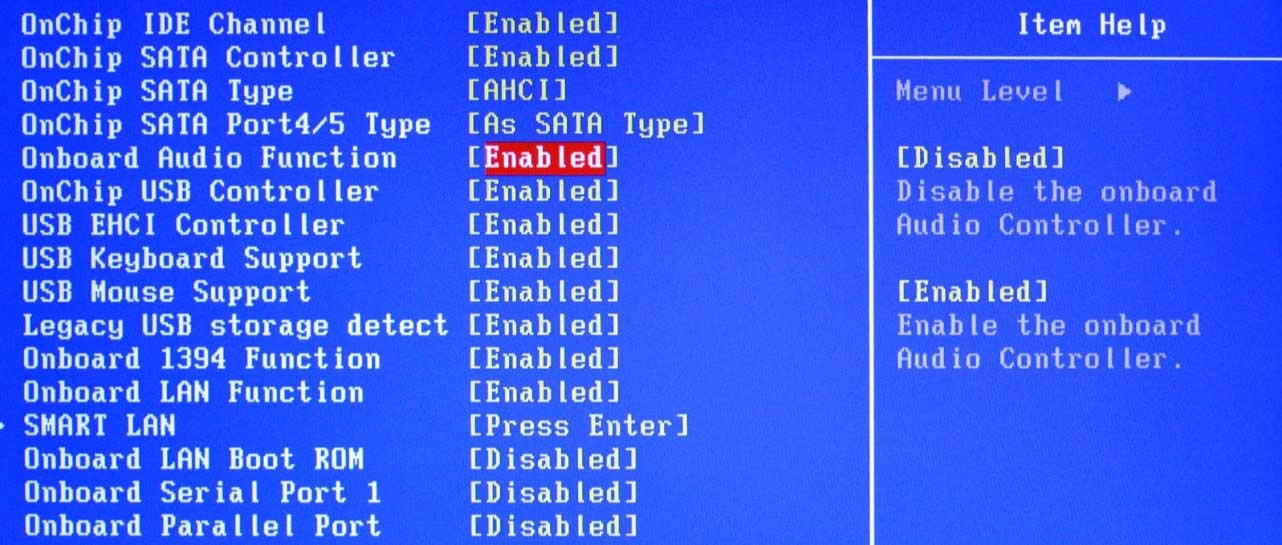 При необходимости можно проверить настройки звука через BIOS: