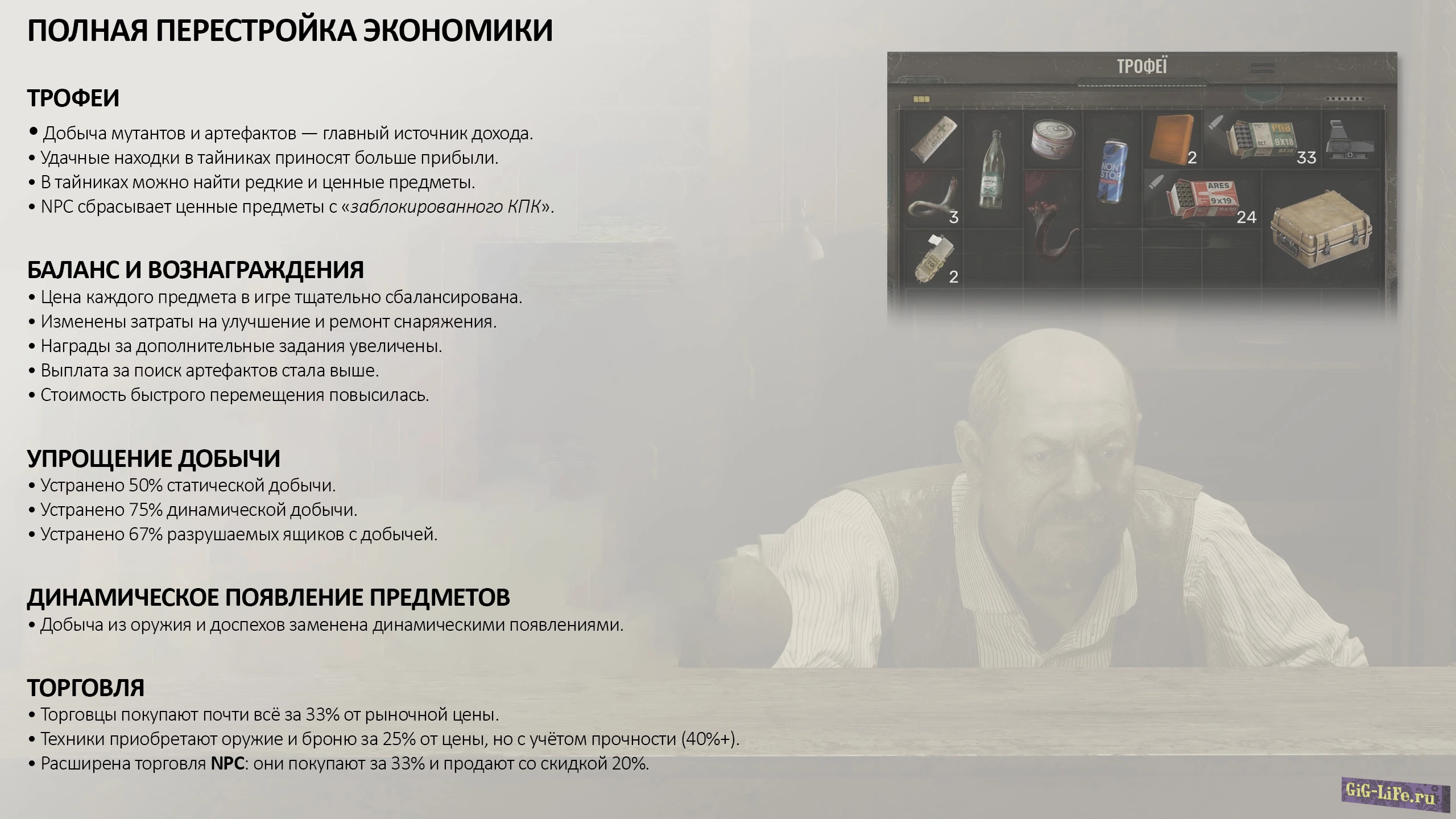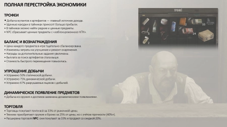 - Теперь акцент смещён с перевозки и продажи оружия с жёлтым уровнем прочности на охоту за артефактами, мутантами и хабаром (сокровищами).